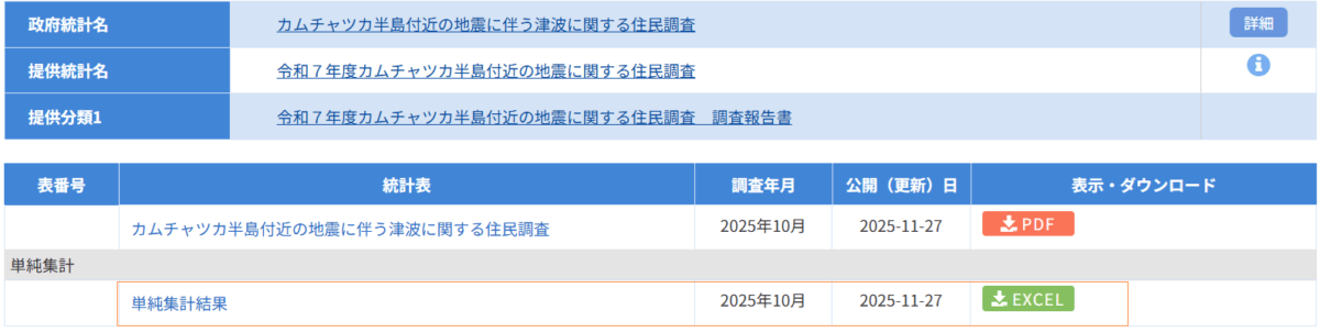 令和7年7月30日に発生したカムチャツカ半島付近の地震により北海道から和歌山県の太平洋側沿岸に津波警報が発表され、発表された地域の市町村において避難指示を発令し、津波からの避難が行われたところである。本調査は、カムチャツカ半島付近の地震を受け、津波警報が発表された地域のうち、避難情報を発令した市町村に在住の住民を対象に、避難情報に伴う津波からの避難の実態調査・分析を行うため、統計法(平成 19 年法律第 53 号)の規定に基づく一般統計調査として「カムチャツカ半島付近の地震に伴う津波に関する住民調査」を実施したものである。(e-Statから引用)