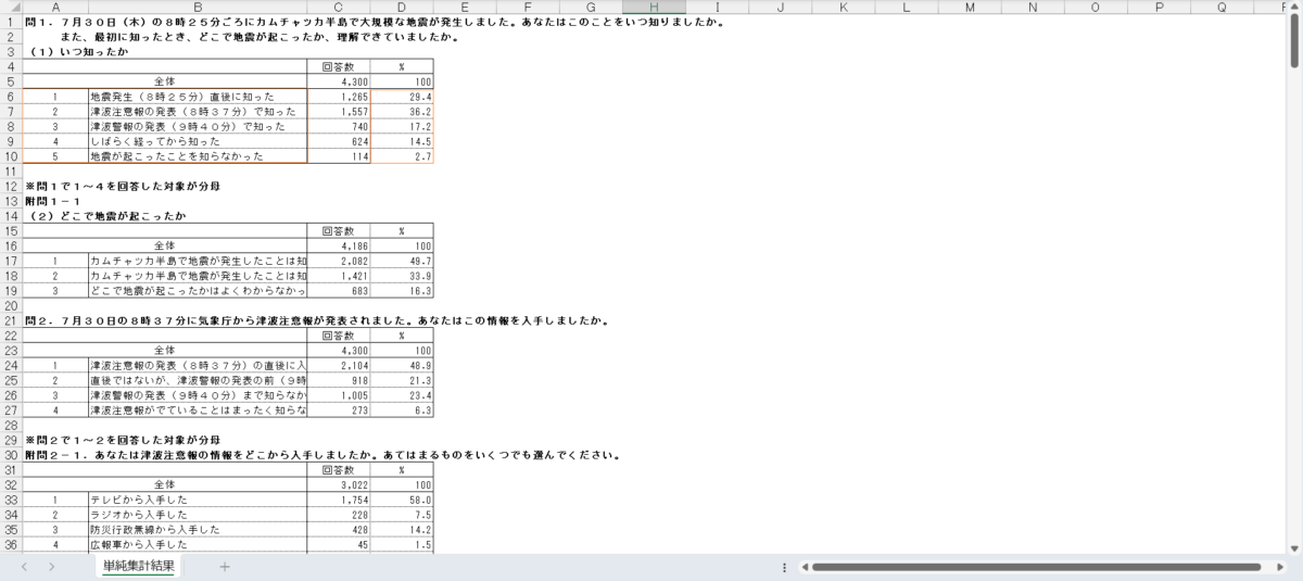 日付,質問,SA or MA,回答,割合 (%) 2025/7/30,問1.7月30日(木)の8時25分ごろにカムチャツカ半島で大規模な地震が発生しました。あなたはこのことをいつ知りましたか。,SA,01_地震発生(8時25分)直後に知った,29.41860465 2025/7/30,問1.7月30日(木)の8時25分ごろにカムチャツカ半島で大規模な地震が発生しました。あなたはこのことをいつ知りましたか。,SA,02_津波注意報の発表(8時37分)で知った,36.20930233 2025/7/30,問1.7月30日(木)の8時25分ごろにカムチャツカ半島で大規模な地震が発生しました。あなたはこのことをいつ知りましたか。,SA,03_津波警報の発表(9時40分)で知った,17.20930233 2025/7/30,問1.7月30日(木)の8時25分ごろにカムチャツカ半島で大規模な地震が発生しました。あなたはこのことをいつ知りましたか。,SA,04_しばらく経ってから知った,14.51162791 2025/7/30,問1.7月30日(木)の8時25分ごろにカムチャツカ半島で大規模な地震が発生しました。あなたはこのことをいつ知りましたか。,SA,05_地震が起こったことを知らなかった,2.651162791 2025/7/30,附問1-1.7月30日(木)の8時25分ごろにカムチャツカ半島で大規模な地震が発生しました。最初に知ったとき、どこで地震が起こったか、理解できていましたか。,SA,01_カムチャツカ半島で地震が発生したことは知っていたし、カムチャツカ半島の場所も理解していた,49.7372193 2025/7/30,附問1-1.7月30日(木)の8時25分ごろにカムチャツカ半島で大規模な地震が発生しました。最初に知ったとき、どこで地震が起こったか、理解できていましたか。,SA,02_カムチャツカ半島で地震が発生したことは知っていたが、カムチャツカ半島の場所はよくわからなかった,33.94648829 2025/7/30,附問1-1.7月30日(木)の8時25分ごろにカムチャツカ半島で大規模な地震が発生しました。最初に知ったとき、どこで地震が起こったか、理解できていましたか。,SA,03_どこで地震が起こったかはよくわからなかった,16.3162924 2025/7/30,問2.7月30日の8時37分に気象庁から津波注意報が発表されました。あなたはこの情報を入手しましたか。,SA,01_津波注意報の発表(8時37分)の直後に入手した,48.93023256