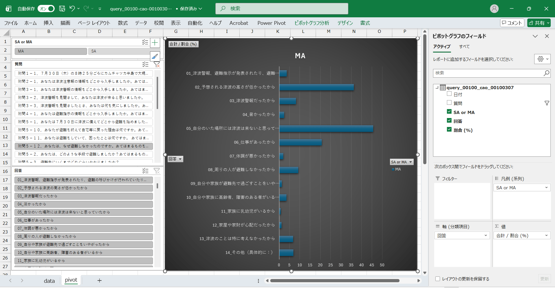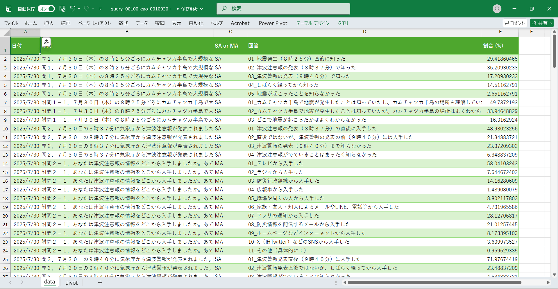 日付,質問,SA or MA,回答,割合 (%) 2025/7/30,問1.7月30日(木)の8時25分ごろにカムチャツカ半島で大規模な地震が発生しました。あなたはこのことをいつ知りましたか。,SA,01_地震発生(8時25分)直後に知った,29.41860465 2025/7/30,問1.7月30日(木)の8時25分ごろにカムチャツカ半島で大規模な地震が発生しました。あなたはこのことをいつ知りましたか。,SA,02_津波注意報の発表(8時37分)で知った,36.20930233 2025/7/30,問1.7月30日(木)の8時25分ごろにカムチャツカ半島で大規模な地震が発生しました。あなたはこのことをいつ知りましたか。,SA,03_津波警報の発表(9時40分)で知った,17.20930233 2025/7/30,問1.7月30日(木)の8時25分ごろにカムチャツカ半島で大規模な地震が発生しました。あなたはこのことをいつ知りましたか。,SA,04_しばらく経ってから知った,14.51162791 2025/7/30,問1.7月30日(木)の8時25分ごろにカムチャツカ半島で大規模な地震が発生しました。あなたはこのことをいつ知りましたか。,SA,05_地震が起こったことを知らなかった,2.651162791 2025/7/30,附問1-1.7月30日(木)の8時25分ごろにカムチャツカ半島で大規模な地震が発生しました。最初に知ったとき、どこで地震が起こったか、理解できていましたか。,SA,01_カムチャツカ半島で地震が発生したことは知っていたし、カムチャツカ半島の場所も理解していた,49.7372193 2025/7/30,附問1-1.7月30日(木)の8時25分ごろにカムチャツカ半島で大規模な地震が発生しました。最初に知ったとき、どこで地震が起こったか、理解できていましたか。,SA,02_カムチャツカ半島で地震が発生したことは知っていたが、カムチャツカ半島の場所はよくわからなかった,33.94648829 2025/7/30,附問1-1.7月30日(木)の8時25分ごろにカムチャツカ半島で大規模な地震が発生しました。最初に知ったとき、どこで地震が起こったか、理解できていましたか。,SA,03_どこで地震が起こったかはよくわからなかった,16.3162924 2025/7/30,問2.7月30日の8時37分に気象庁から津波注意報が発表されました。あなたはこの情報を入手しましたか。,SA,01_津波注意報の発表(8時37分)の直後に入手した,48.93023256