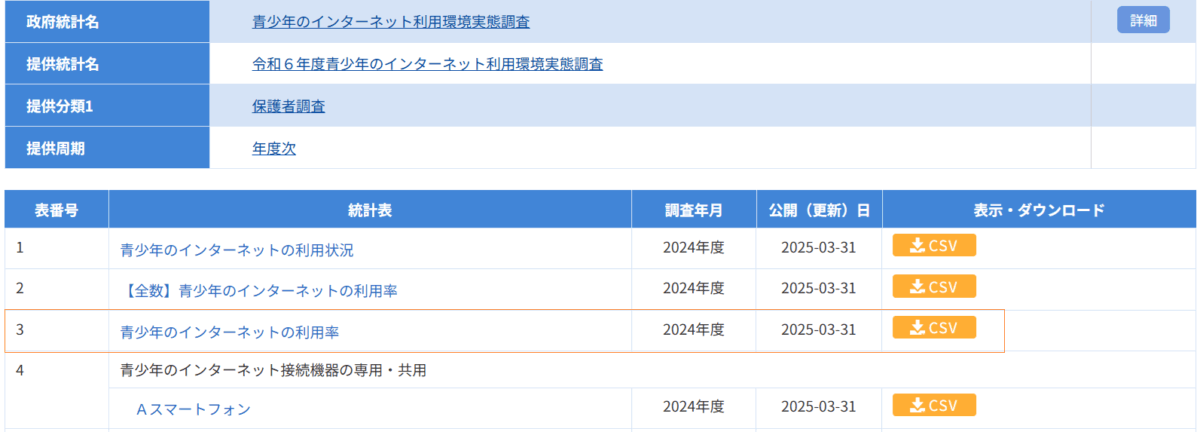 青少年のインターネット利用環境実態調査は、青少年が安全に安心してインターネットを利用できる環境の整備を推進するため、平成21年度より、青少年及びその保護者を対象として、情報モラル教育の認知度、フィルタリングの利用度等を調査し、青少年インターネット環境整備法の実施状況を検証するとともに、青少年のインターネット利用環境整備に関する基礎データを得ることを目的として実施しています。(e-Statから引用)