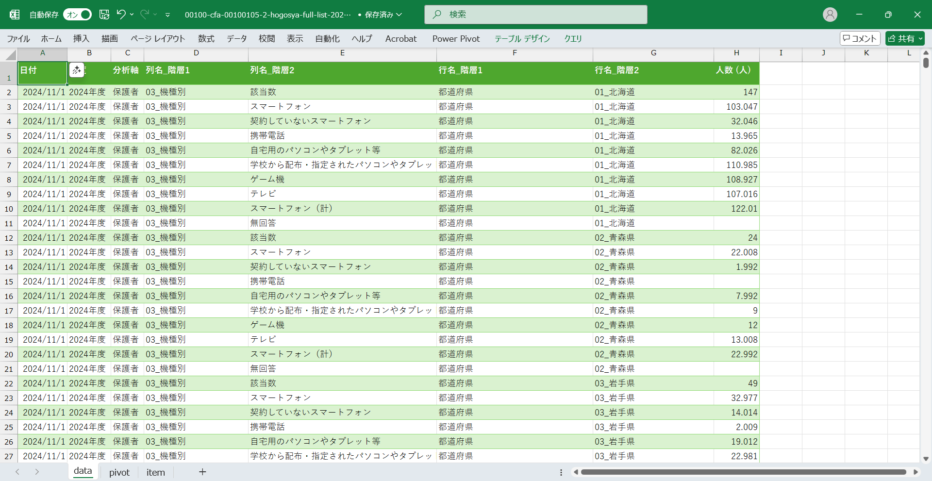 日付,年度,分析軸,列名_階層1,列名_階層2,行名_階層1,行名_階層2,人数 (人) 2022/11/1,2022年度,保護者,03_機種別,ゲーム機,都道府県,01_北海道,113.064 2022/11/1,2022年度,保護者,03_機種別,スマートフォン,都道府県,01_北海道,128.016 2022/11/1,2022年度,保護者,03_機種別,スマートフォン(計),都道府県,01_北海道,141.96 2022/11/1,2022年度,保護者,03_機種別,テレビ,都道府県,01_北海道,88.032 2022/11/1,2022年度,保護者,03_機種別,該当数,都道府県,01_北海道,168 2022/11/1,2022年度,保護者,03_機種別,学校から配布・指定されたパソコンやタブレット等,都道府県,01_北海道,96.936 2022/11/1,2022年度,保護者,03_機種別,契約していないスマートフォン,都道府県,01_北海道,26.04 2022/11/1,2022年度,保護者,03_機種別,携帯電話,都道府県,01_北海道,5.04 2022/11/1,2022年度,保護者,03_機種別,自宅用のパソコンやタブレット等,都道府県,01_北海道,95.928