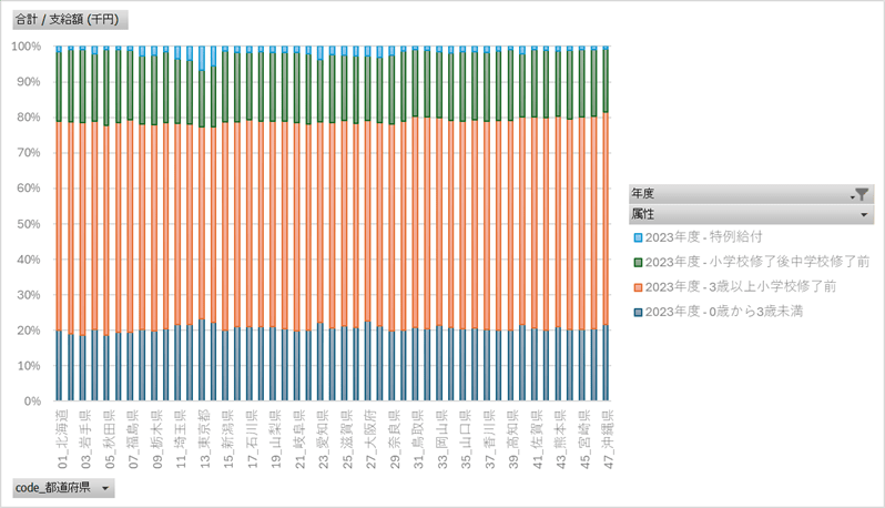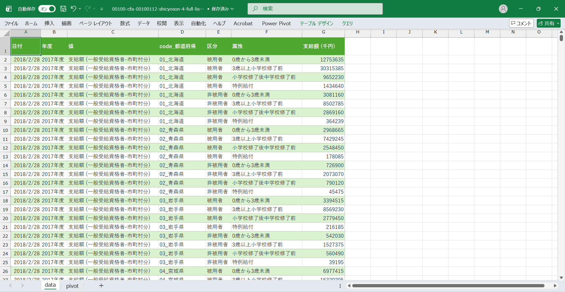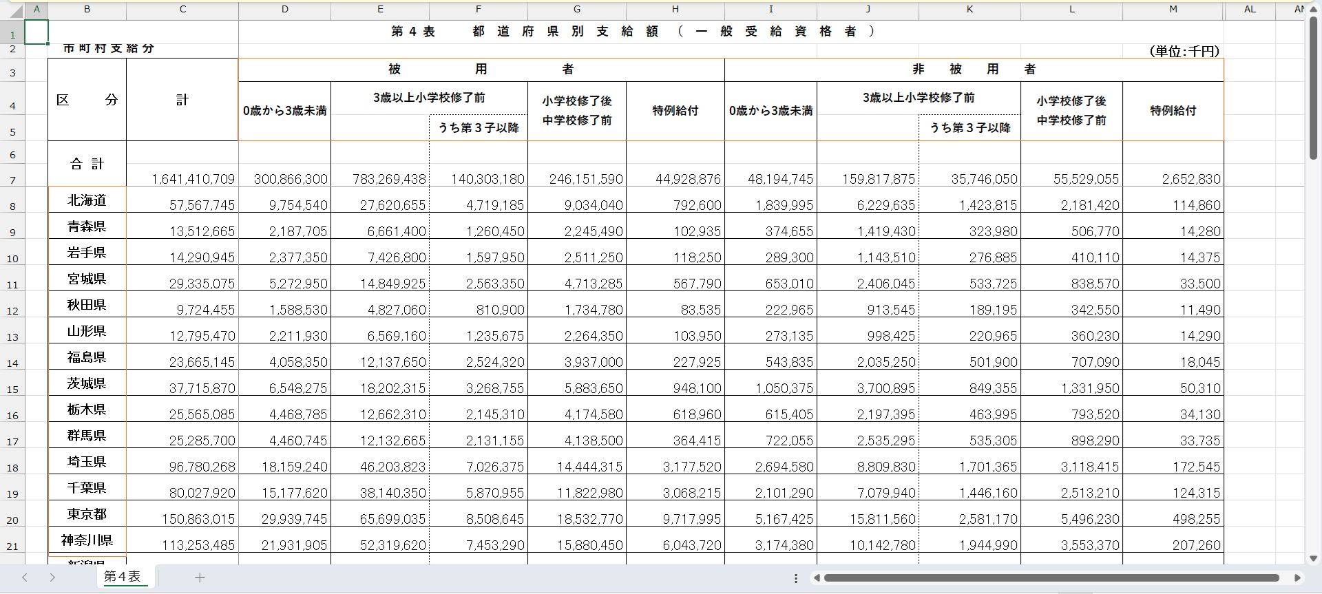 日付,年度,値,code_都道府県,区分,属性,支給額 (千円) 2018/2/28,2017年度,支給額 (一般受給資格者-市町村分),01_北海道,被用者,0歳から3歳未満,12753635 2018/2/28,2017年度,支給額 (一般受給資格者-市町村分),01_北海道,被用者,3歳以上小学校修了前,30315385 2018/2/28,2017年度,支給額 (一般受給資格者-市町村分),01_北海道,被用者,小学校修了後中学校修了前,9652230 2018/2/28,2017年度,支給額 (一般受給資格者-市町村分),01_北海道,被用者,特例給付,1434640 2018/2/28,2017年度,支給額 (一般受給資格者-市町村分),01_北海道,非被用者,0歳から3歳未満,3081160 2018/2/28,2017年度,支給額 (一般受給資格者-市町村分),01_北海道,非被用者,3歳以上小学校修了前,8502785 2018/2/28,2017年度,支給額 (一般受給資格者-市町村分),01_北海道,非被用者,小学校修了後中学校修了前,2869160 2018/2/28,2017年度,支給額 (一般受給資格者-市町村分),01_北海道,非被用者,特例給付,364239 2018/2/28,2017年度,支給額 (一般受給資格者-市町村分),02_青森県,被用者,0歳から3歳未満,2968665