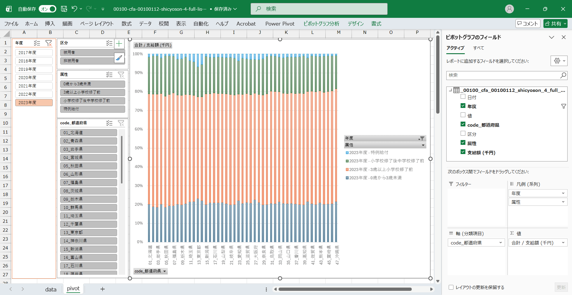 児童手当事業年報_市町村支給分_表4_都道府県別支給額(一般受給資格者)_年度次 2017年度 – 2023年度 (列指向形式)