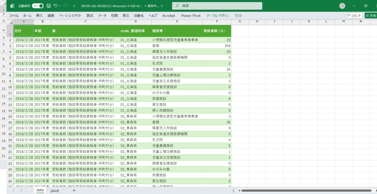 日付,年度,値,code_都道府県,施設等,受給者数 (人) 2018/2/28,2017年度,受給者数 (施設等受給資格者-市町村分),01_北海道,小規模住居型児童養育事業者,29 2018/2/28,2017年度,受給者数 (施設等受給資格者-市町村分),01_北海道,里親,269 2018/2/28,2017年度,受給者数 (施設等受給資格者-市町村分),01_北海道,障害児入所施設,20 2018/2/28,2017年度,受給者数 (施設等受給資格者-市町村分),01_北海道,指定発達支援医療機関,0 2018/2/28,2017年度,受給者数 (施設等受給資格者-市町村分),01_北海道,乳児院,2 2018/2/28,2017年度,受給者数 (施設等受給資格者-市町村分),01_北海道,児童養護施設,26 2018/2/28,2017年度,受給者数 (施設等受給資格者-市町村分),01_北海道,児童心理治療施設,2 2018/2/28,2017年度,受給者数 (施設等受給資格者-市町村分),01_北海道,児童自立支援施設,3 2018/2/28,2017年度,受給者数 (施設等受給資格者-市町村分),01_北海道,障害者支援施設,0