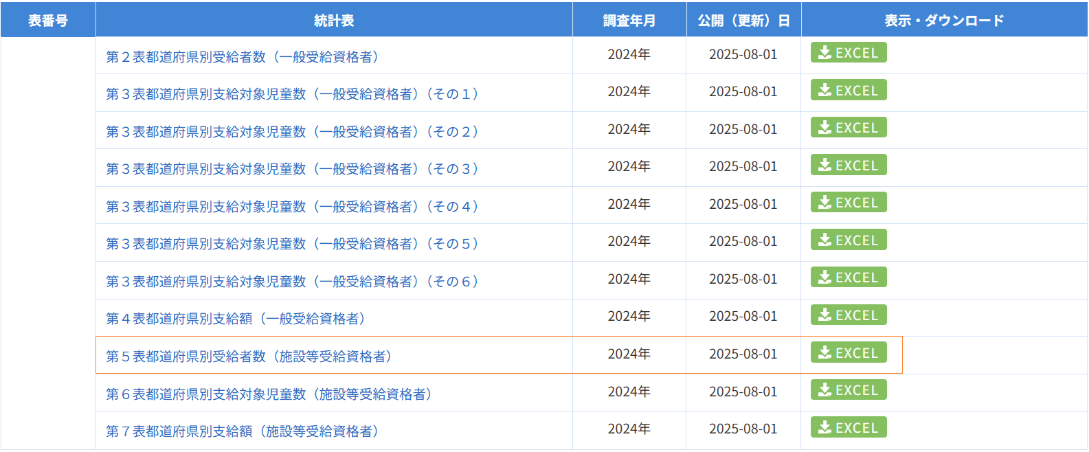 児童手当事業年報は、各都道府県、各省各庁から提出された児童手当支給状況報告等に基づき、児童手当の事業の実施状況を収録したものである。 (e-Statから引用)