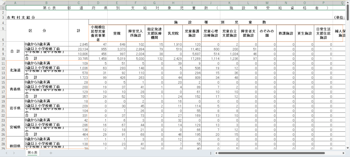 児童手当事業年報_市町村支給分_表6_都道府県別支給対象児童数(施設等受給資格者)_年度次 2017年度 – 2023年度 (列指向形式)
