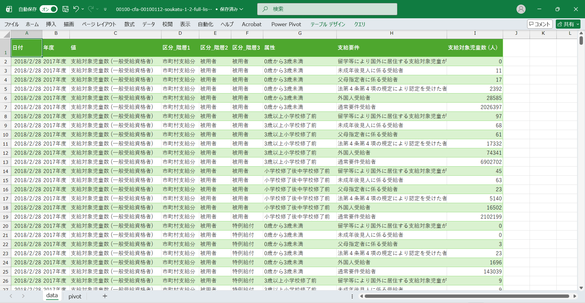 日付,年度,値,区分_階層1,区分_階層2,区分_階層3,属性,支給要件,支給対象児童数 (人) 2018/2/28,2017年度,支給対象児童数 (一般受給資格者),市町村支給分,被用者,児童手当,0歳から3歳未満,留学等により国外に居住する支給対象児童がいる受給者,0 2018/2/28,2017年度,支給対象児童数 (一般受給資格者),市町村支給分,被用者,児童手当,0歳から3歳未満,未成年後見人に係る受給者,11 2018/2/28,2017年度,支給対象児童数 (一般受給資格者),市町村支給分,被用者,児童手当,0歳から3歳未満,父母指定者に係る受給者,17 2018/2/28,2017年度,支給対象児童数 (一般受給資格者),市町村支給分,被用者,児童手当,0歳から3歳未満,法第4条第4項の規定により認定を受けた者(同居父母)に係る受給者,2392 2018/2/28,2017年度,支給対象児童数 (一般受給資格者),市町村支給分,被用者,児童手当,0歳から3歳未満,外国人受給者,28585 2018/2/28,2017年度,支給対象児童数 (一般受給資格者),市町村支給分,被用者,児童手当,0歳から3歳未満,通常要件受給者,2026397 2018/2/28,2017年度,支給対象児童数 (一般受給資格者),市町村支給分,被用者,児童手当,3歳以上小学校修了前,留学等により国外に居住する支給対象児童がいる受給者,97 2018/2/28,2017年度,支給対象児童数 (一般受給資格者),市町村支給分,被用者,児童手当,3歳以上小学校修了前,未成年後見人に係る受給者,68 2018/2/28,2017年度,支給対象児童数 (一般受給資格者),市町村支給分,被用者,児童手当,3歳以上小学校修了前,父母指定者に係る受給者,61