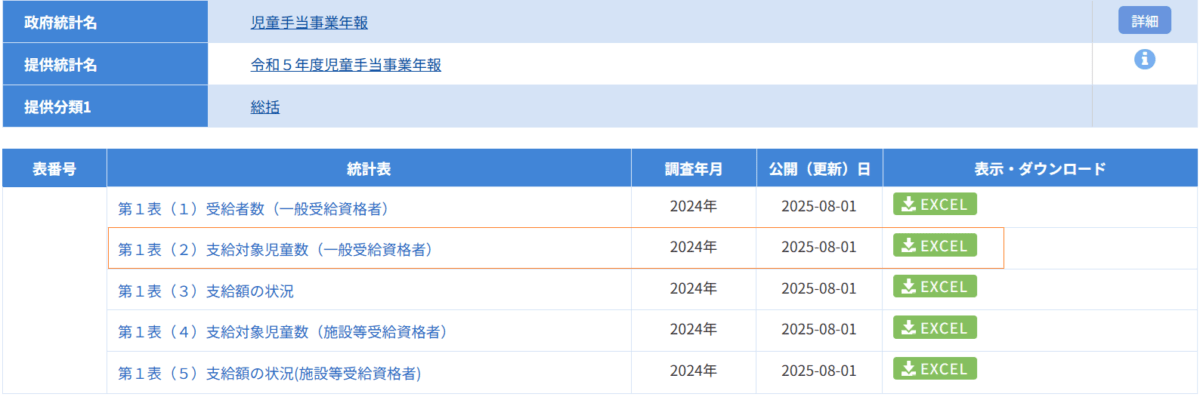 児童手当事業年報は、各都道府県、各省各庁から提出された児童手当支給状況報告等に基づき、児童手当の事業の実施状況を収録したものである。 (e-Statから引用)
