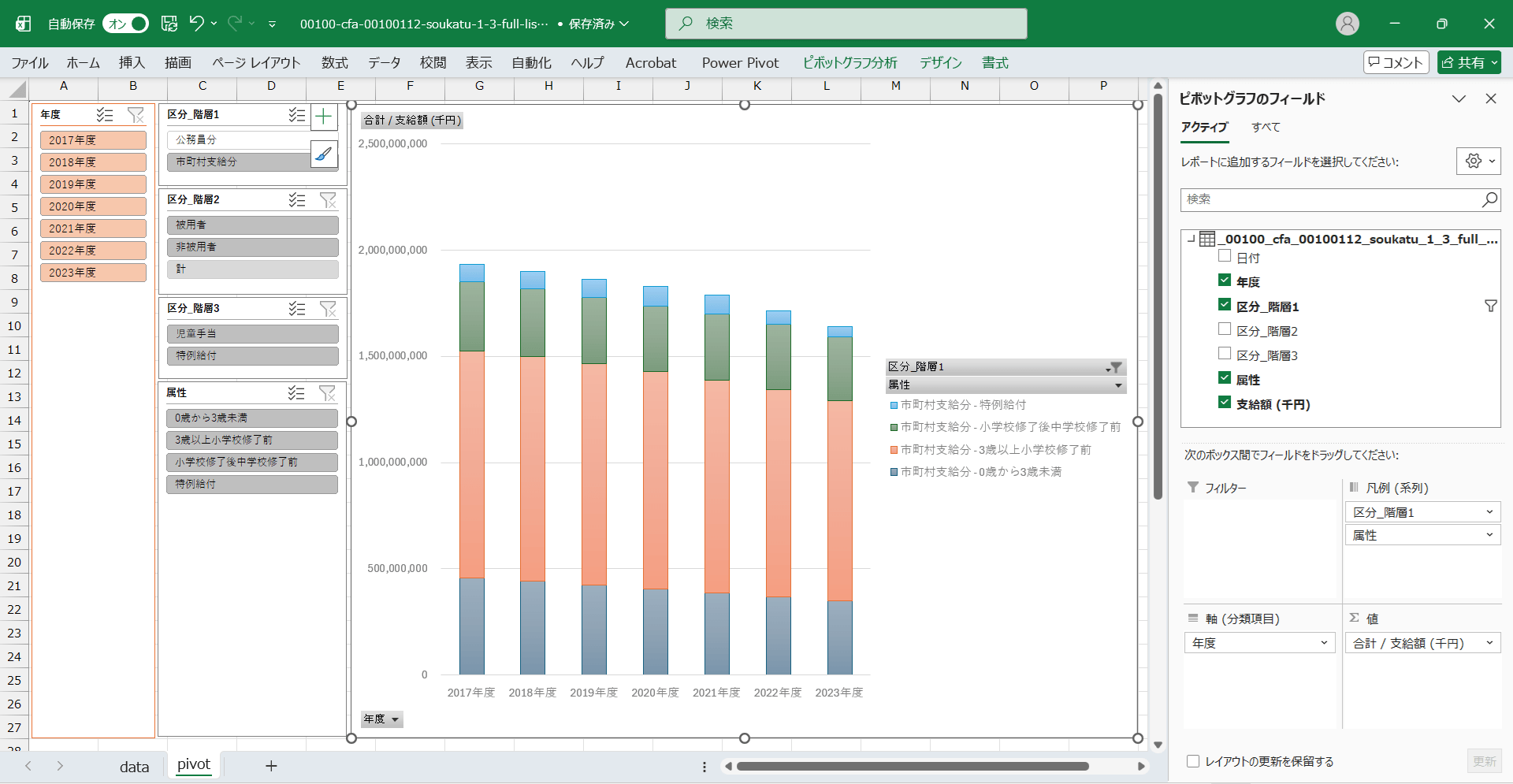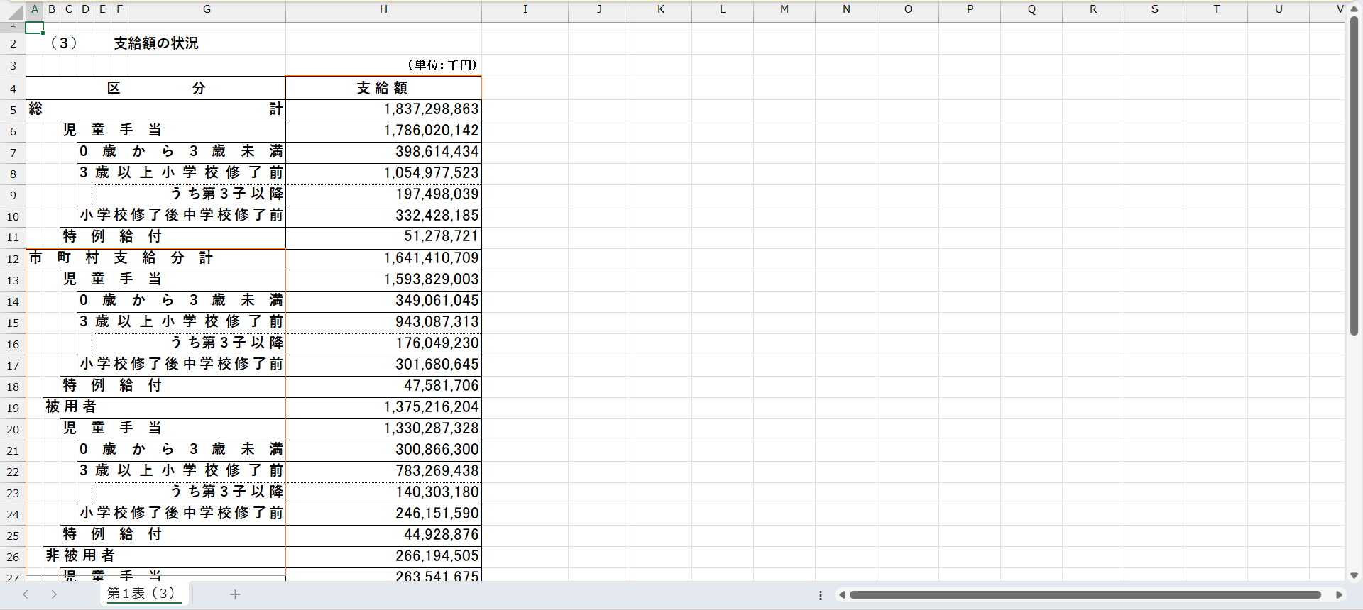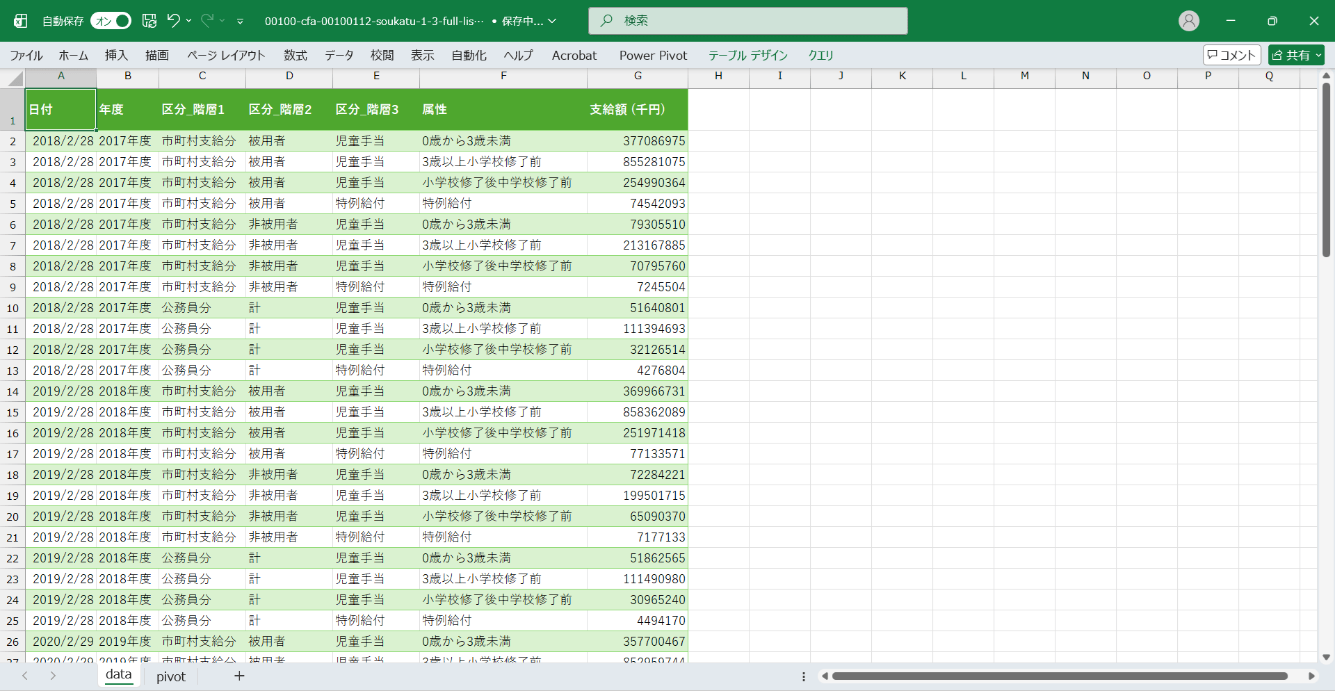 日付,年度,区分_階層1,区分_階層2,区分_階層3,属性,支給額 (千円) 2018/2/28,2017年度,市町村支給分,被用者,児童手当,0歳から3歳未満,377086975 2018/2/28,2017年度,市町村支給分,被用者,児童手当,3歳以上小学校修了前,855281075 2018/2/28,2017年度,市町村支給分,被用者,児童手当,小学校修了後中学校修了前,254990364 2018/2/28,2017年度,市町村支給分,被用者,特例給付,特例給付,74542093 2018/2/28,2017年度,市町村支給分,非被用者,児童手当,0歳から3歳未満,79305510 2018/2/28,2017年度,市町村支給分,非被用者,児童手当,3歳以上小学校修了前,213167885 2018/2/28,2017年度,市町村支給分,非被用者,児童手当,小学校修了後中学校修了前,70795760 2018/2/28,2017年度,市町村支給分,非被用者,特例給付,特例給付,7245504 2018/2/28,2017年度,公務員分,計,児童手当,0歳から3歳未満,51640801