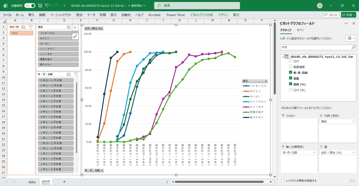 乳幼児身体発育調査_12-13_乳幼児の運動機能通・言語機能過率_年次 2023年 (列指向形式)