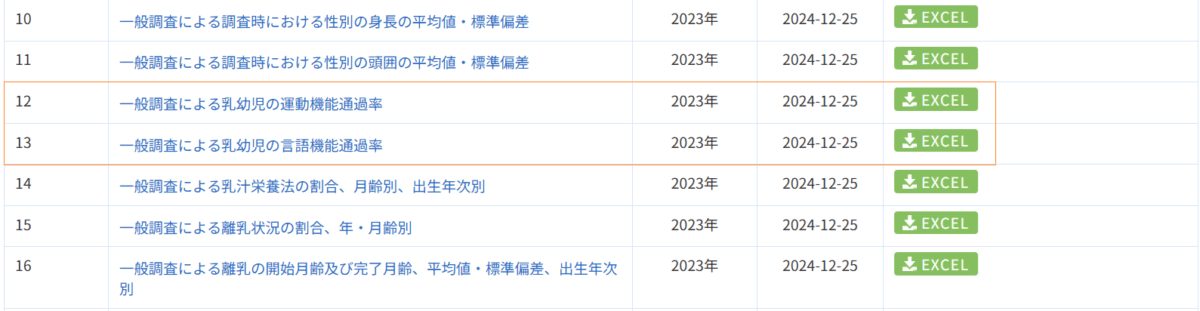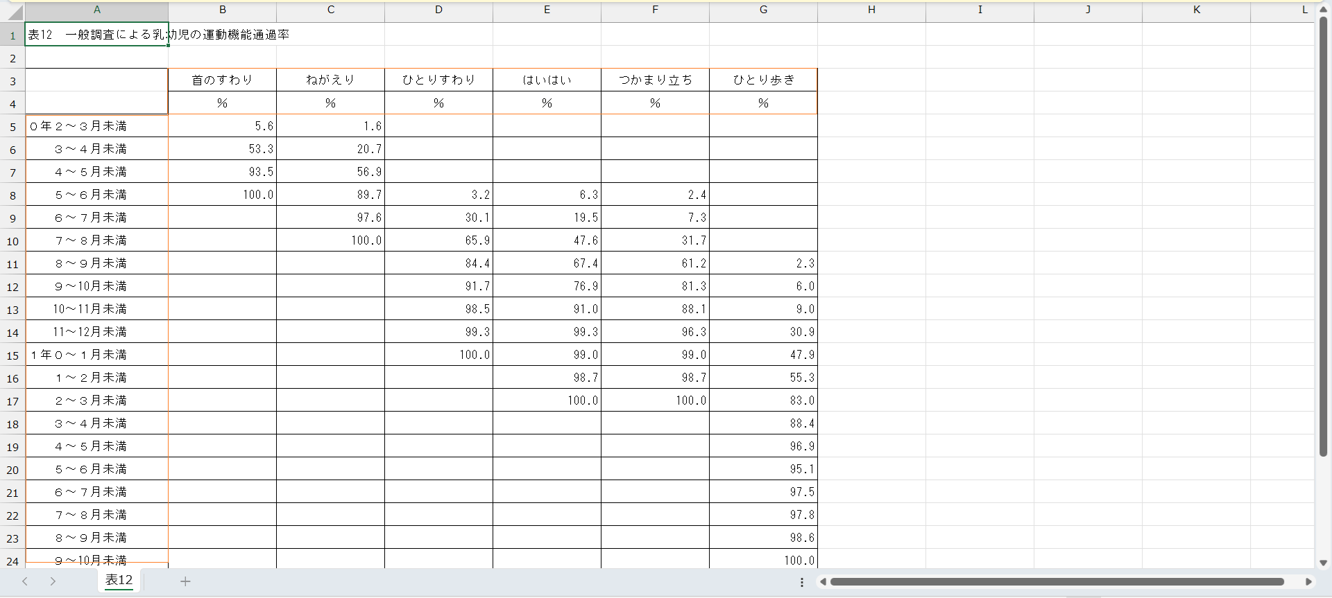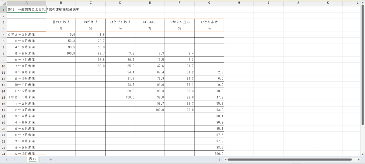 日付,調査機関,年・月・日齢,項目,割合 (%) 2023/4/1,一般,0年2~3月未満,首のすわり,5.555555556 2023/4/1,一般,0年2~3月未満,ねがえり,1.587301587 2023/4/1,一般,0年3~4月未満,首のすわり,53.33333333 2023/4/1,一般,0年3~4月未満,ねがえり,20.66666667 2023/4/1,一般,0年4~5月未満,首のすわり,93.46405229 2023/4/1,一般,0年4~5月未満,ねがえり,56.8627451 2023/4/1,一般,0年5~6月未満,首のすわり,100 2023/4/1,一般,0年5~6月未満,ねがえり,89.68253968 2023/4/1,一般,0年5~6月未満,ひとりすわり,3.174603175