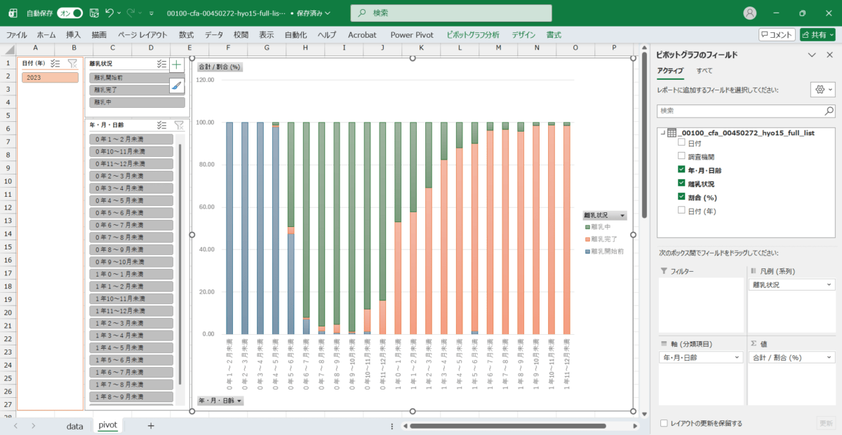 <無料> 乳幼児身体発育調査_15_離乳状況の割合、年・月齢別_年次 2023年 (列指向形式)