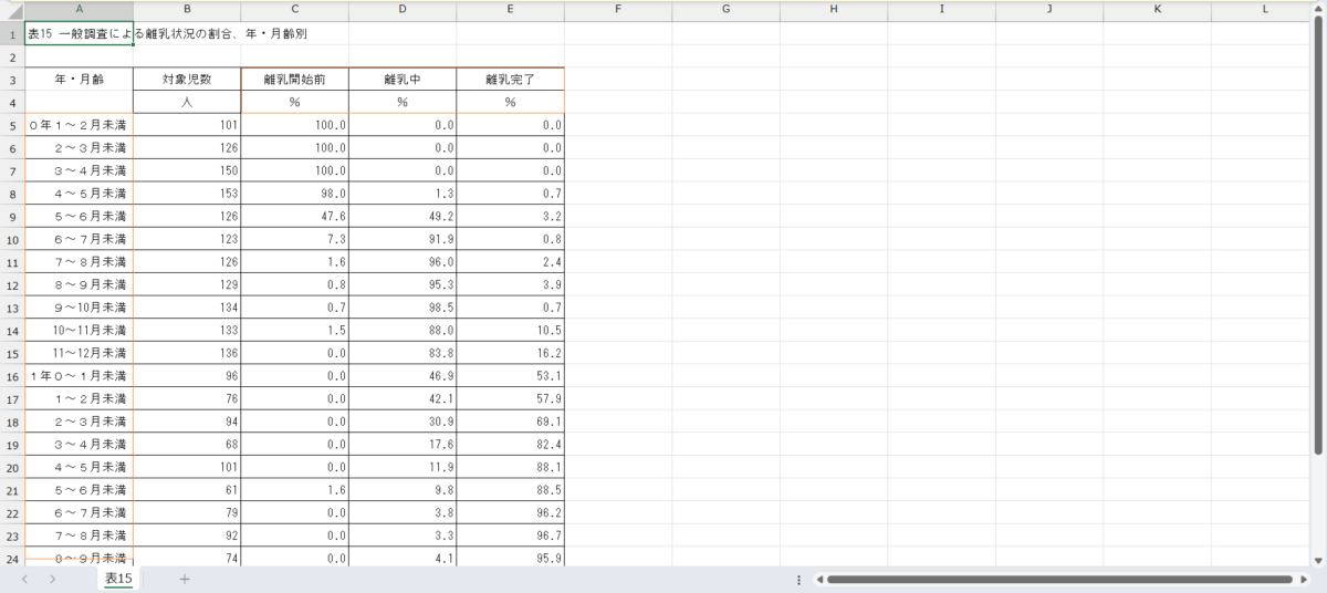 乳幼児身体発育調査_15_離乳状況の割合、年・月齢別_年次 2023年 (列指向形式)