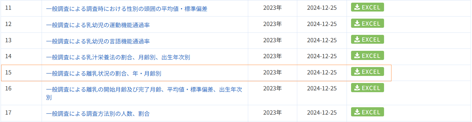 乳幼児身体発育調査_15_離乳状況の割合、年・月齢別_年次 2023年 (列指向形式)