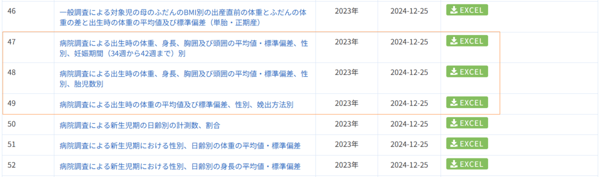 乳幼児身体発育調査_47-49_57-59_出生時の身体発育値_年次 2023年 (列 – 複数値形式)
