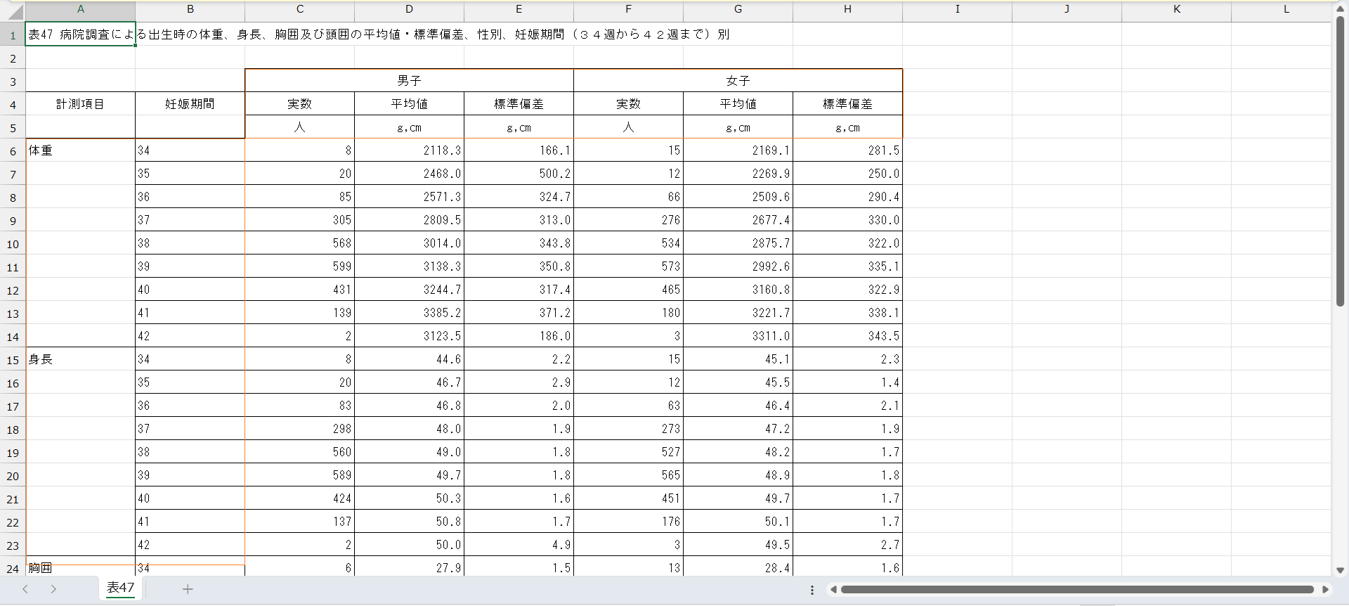日付,調査機関,計測項目,項目,属性,性別,単位,平均値,標準偏差 2023/4/1,病院,体重,妊娠期間,34(週),女子,g,2169.066667,281.4907932 2023/4/1,病院,体重,妊娠期間,34(週),男子,g,2118.25,166.0935623 2023/4/1,病院,体重,妊娠期間,35(週),女子,g,2269.916667,250.0085302 2023/4/1,病院,体重,妊娠期間,35(週),男子,g,2468,500.1719704 2023/4/1,病院,体重,妊娠期間,36(週),女子,g,2509.621212,290.3898581 2023/4/1,病院,体重,妊娠期間,36(週),男子,g,2571.317647,324.7420299 2023/4/1,病院,体重,妊娠期間,37(週),女子,g,2677.351449,330.0016138 2023/4/1,病院,体重,妊娠期間,37(週),男子,g,2809.540984,313.0065144 2023/4/1,病院,体重,妊娠期間,38(週),女子,g,2875.689139,321.9987135
