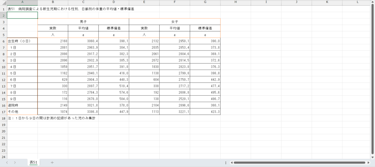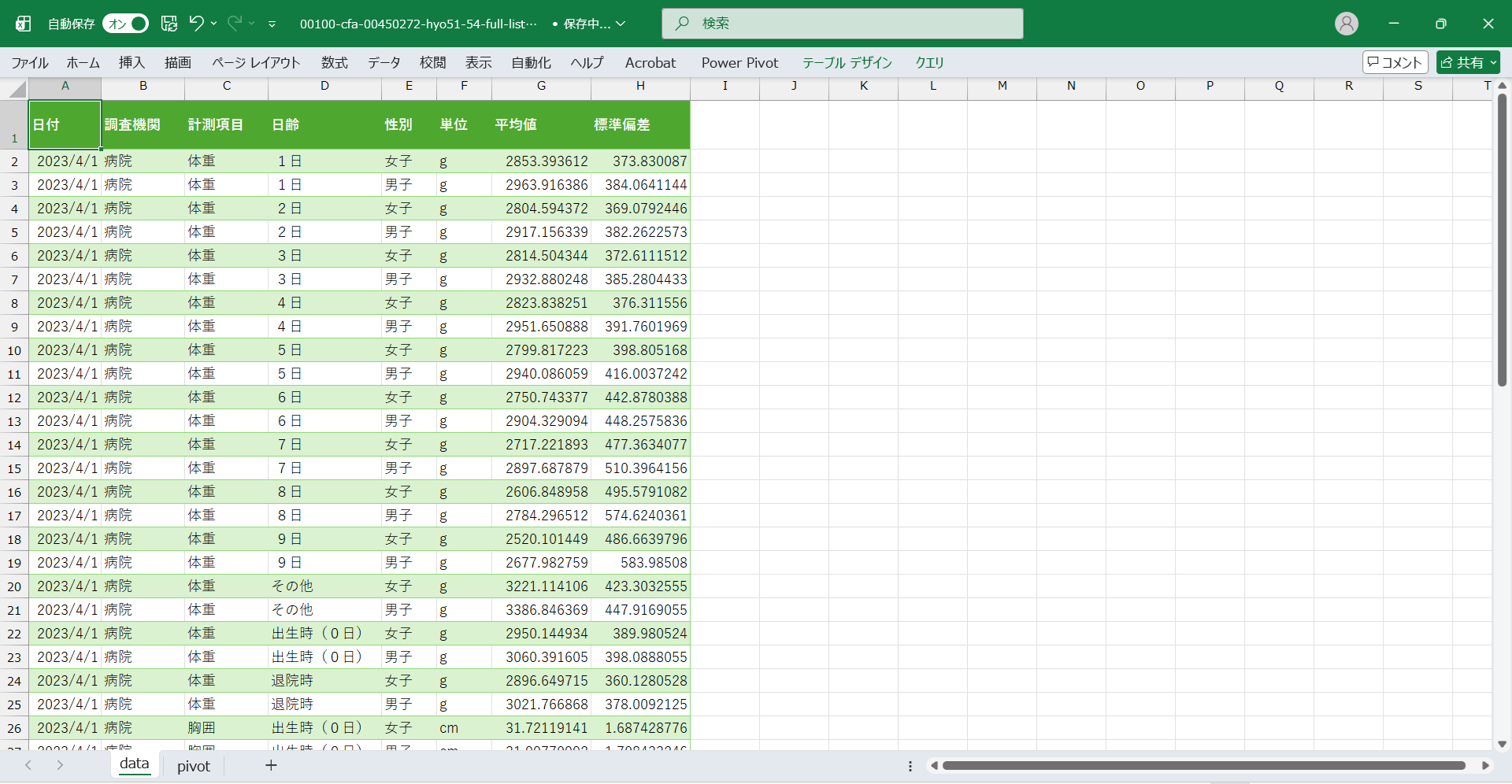 日付,調査機関,計測項目,日齢,性別,単位,平均値,標準偏差 2023/4/1,病院,体重, 1日,女子,g,2853.393612,373.830087 2023/4/1,病院,体重, 1日,男子,g,2963.916386,384.0641144 2023/4/1,病院,体重, 2日,女子,g,2804.594372,369.0792446 2023/4/1,病院,体重, 2日,男子,g,2917.156339,382.2622573 2023/4/1,病院,体重, 3日,女子,g,2814.504344,372.6111512 2023/4/1,病院,体重, 3日,男子,g,2932.880248,385.2804433 2023/4/1,病院,体重, 4日,女子,g,2823.838251,376.311556 2023/4/1,病院,体重, 4日,男子,g,2951.650888,391.7601969 2023/4/1,病院,体重, 5日,女子,g,2799.817223,398.805168