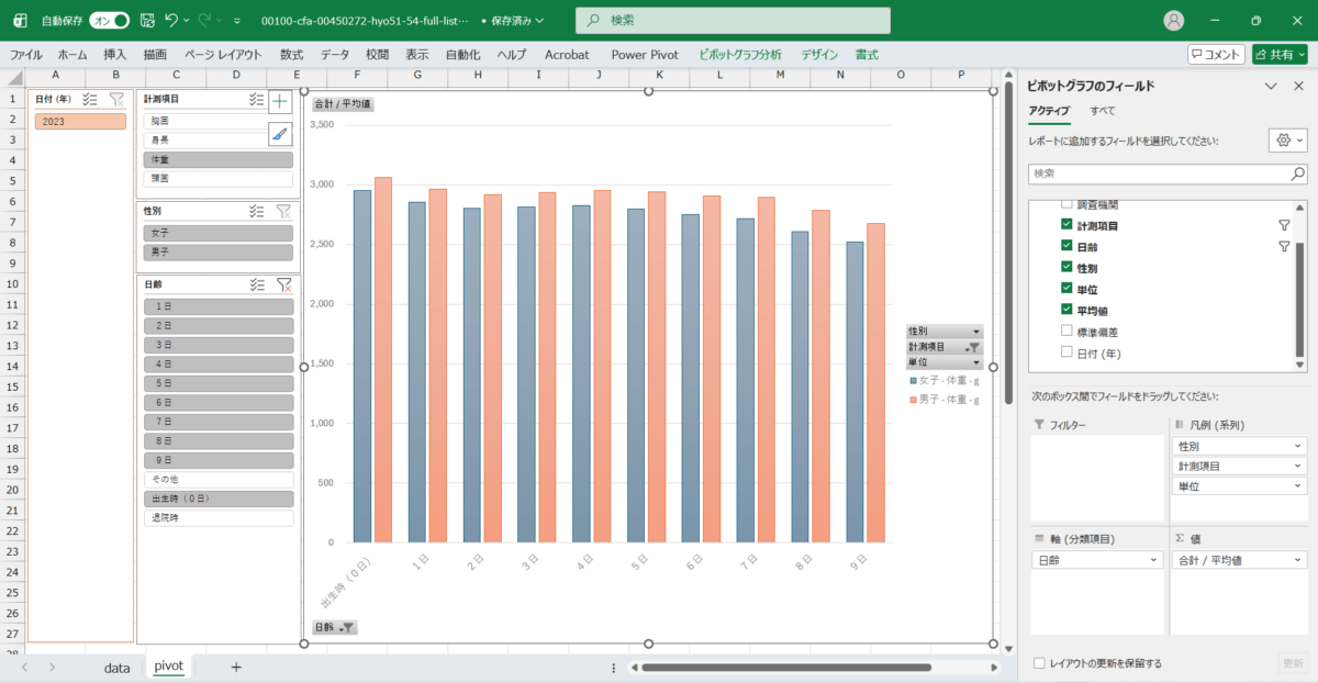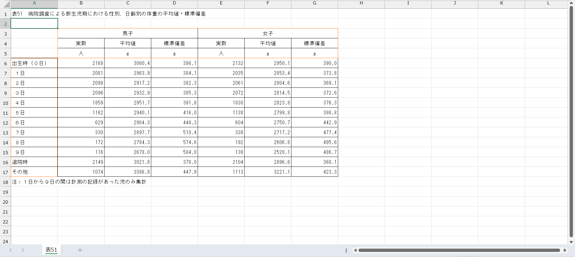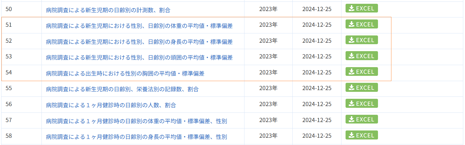 乳幼児身体発育調査_51-54_新生児期の身体発育値_年次 2023年 (列 – 複数値形式)