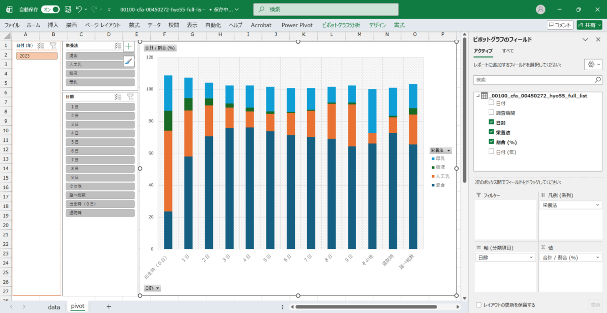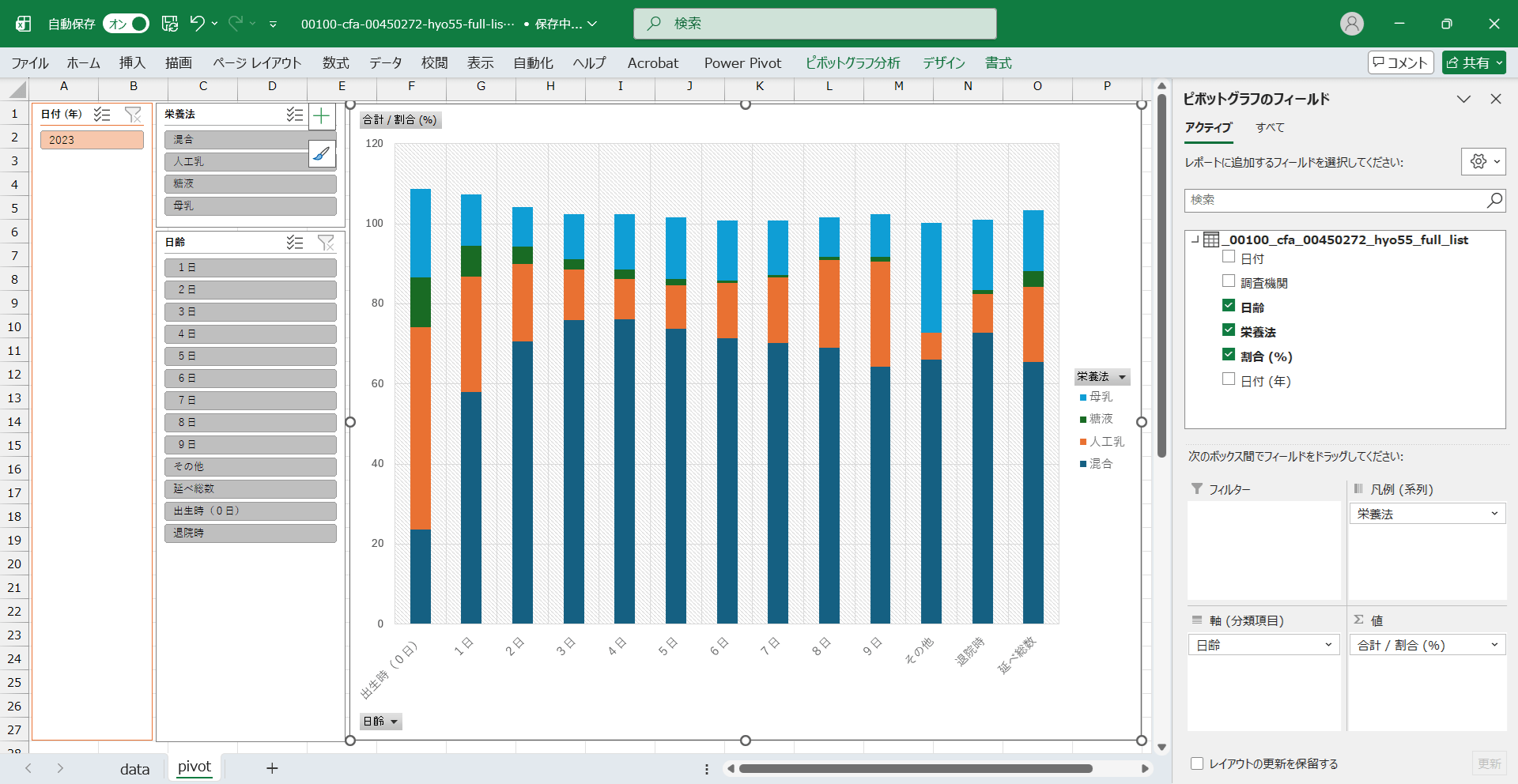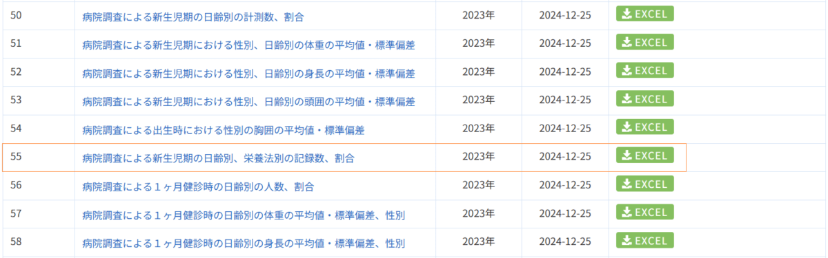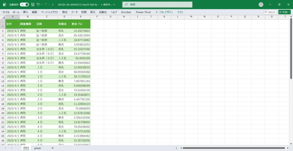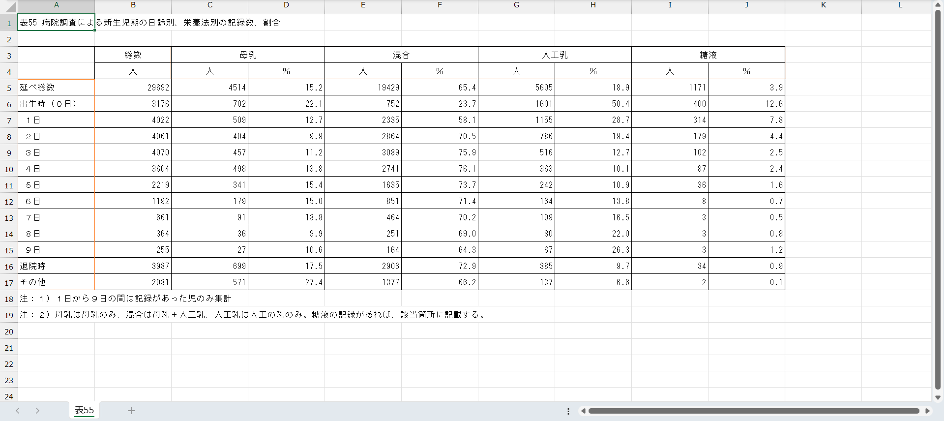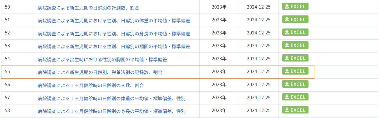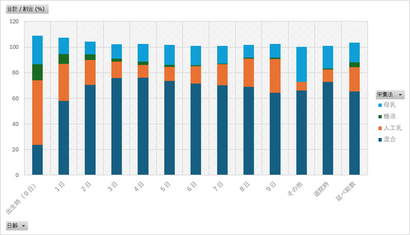 日付,調査機関,日齢,栄養法,割合 (%) 2023/4/1,病院,延べ総数,母乳,15.20274822 2023/4/1,病院,延べ総数,混合,65.43513404 2023/4/1,病院,延べ総数,人工乳,18.87713862 2023/4/1,病院,延べ総数,糖液,3.943823252 2023/4/1,病院,出生時(0日),母乳,22.10327456 2023/4/1,病院,出生時(0日),混合,23.67758186 2023/4/1,病院,出生時(0日),人工乳,50.4093199 2023/4/1,病院,出生時(0日),糖液,12.59445844 2023/4/1,病院, 1日,母乳,12.65539533