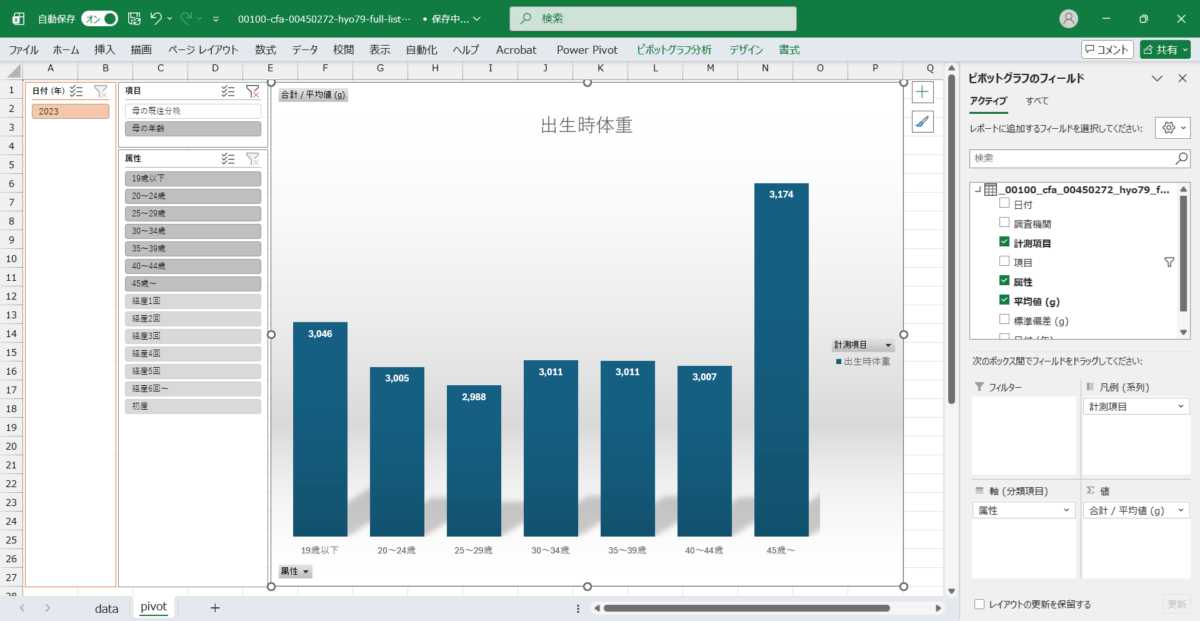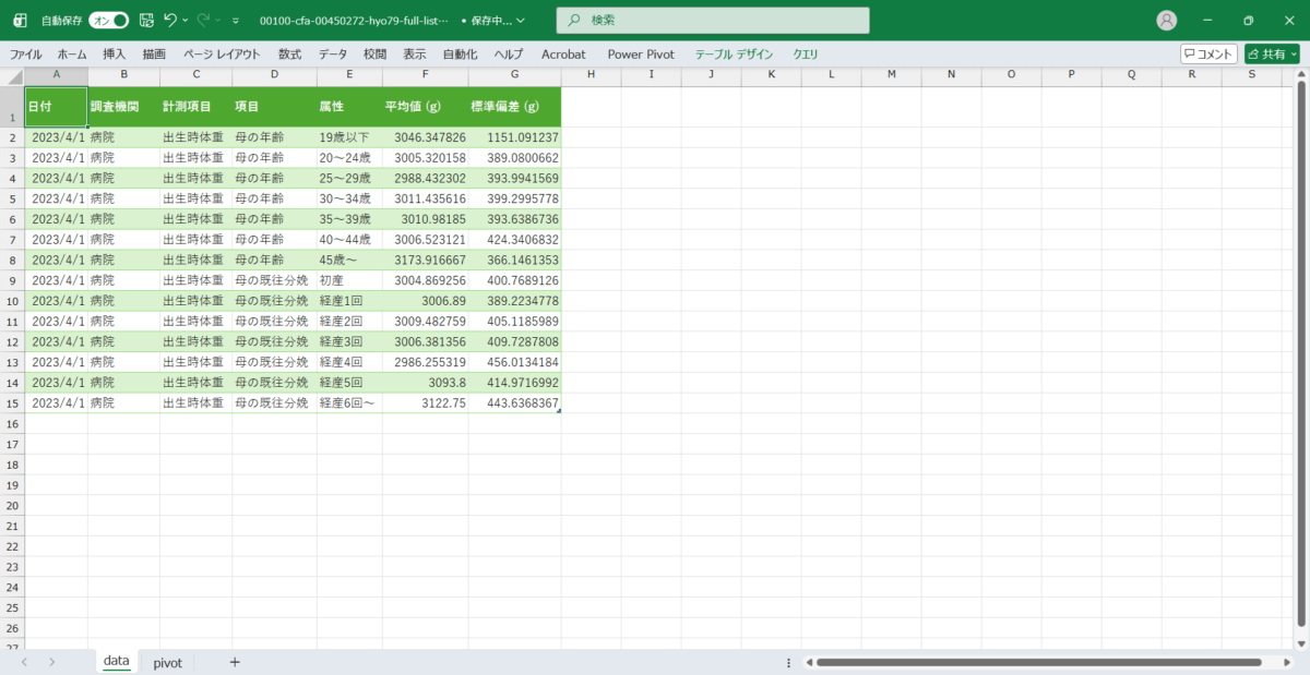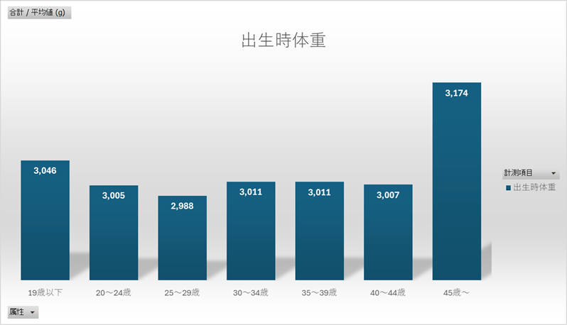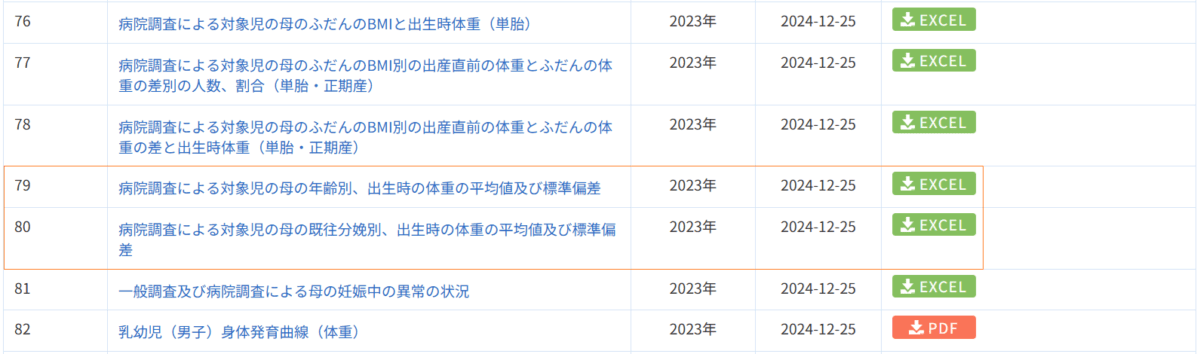 日付,調査機関,計測項目,項目,属性,平均値 (g),標準偏差 (g) 2023/4/1,病院,出生時体重,母の年齢,19歳以下,3046.347826,1151.091237 2023/4/1,病院,出生時体重,母の年齢,20~24歳,3005.320158,389.0800662 2023/4/1,病院,出生時体重,母の年齢,25~29歳,2988.432302,393.9941569 2023/4/1,病院,出生時体重,母の年齢,30~34歳,3011.435616,399.2995778 2023/4/1,病院,出生時体重,母の年齢,35~39歳,3010.98185,393.6386736 2023/4/1,病院,出生時体重,母の年齢,40~44歳,3006.523121,424.3406832 2023/4/1,病院,出生時体重,母の年齢,45歳~,3173.916667,366.1461353 2023/4/1,病院,出生時体重,母の既往分娩,初産,3004.869256,400.7689126 2023/4/1,病院,出生時体重,母の既往分娩,経産1回,3006.89,389.2234778