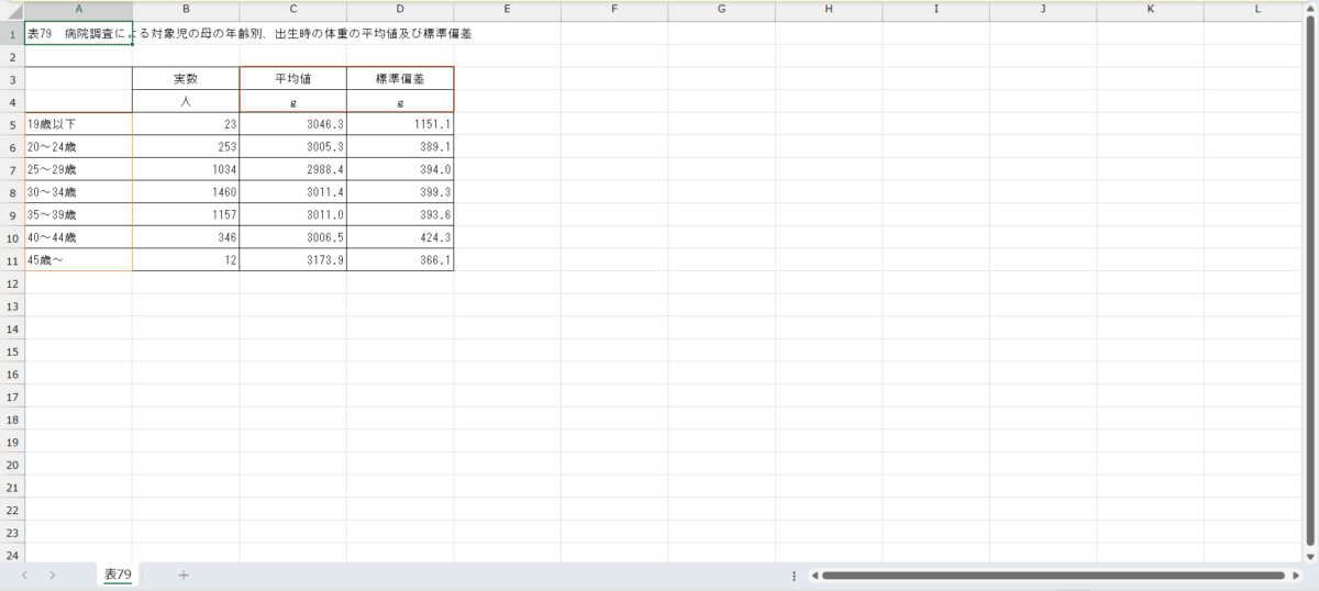 乳幼児身体発育調査_79_母の年齢別、出生時の体重の平均値及び標準偏差_年次 2023年 (列 – 複数値形式)