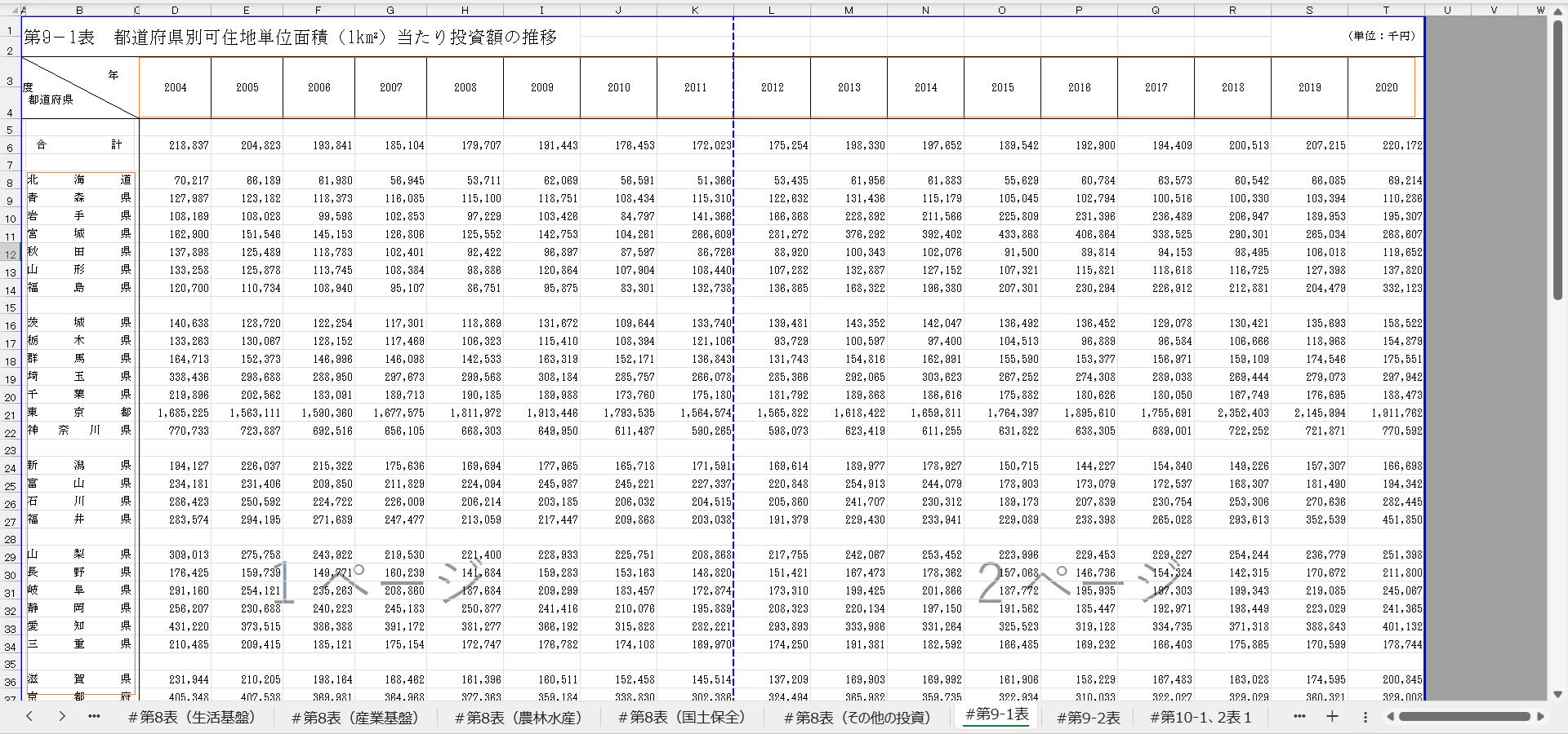 行政投資実績<都道府県別行政投資実績報告書>_表9_都道府県別可住地単位面積(1km2)当たり投資額の推移_年度次 2004年度 – 2022年度 (列指向形式)