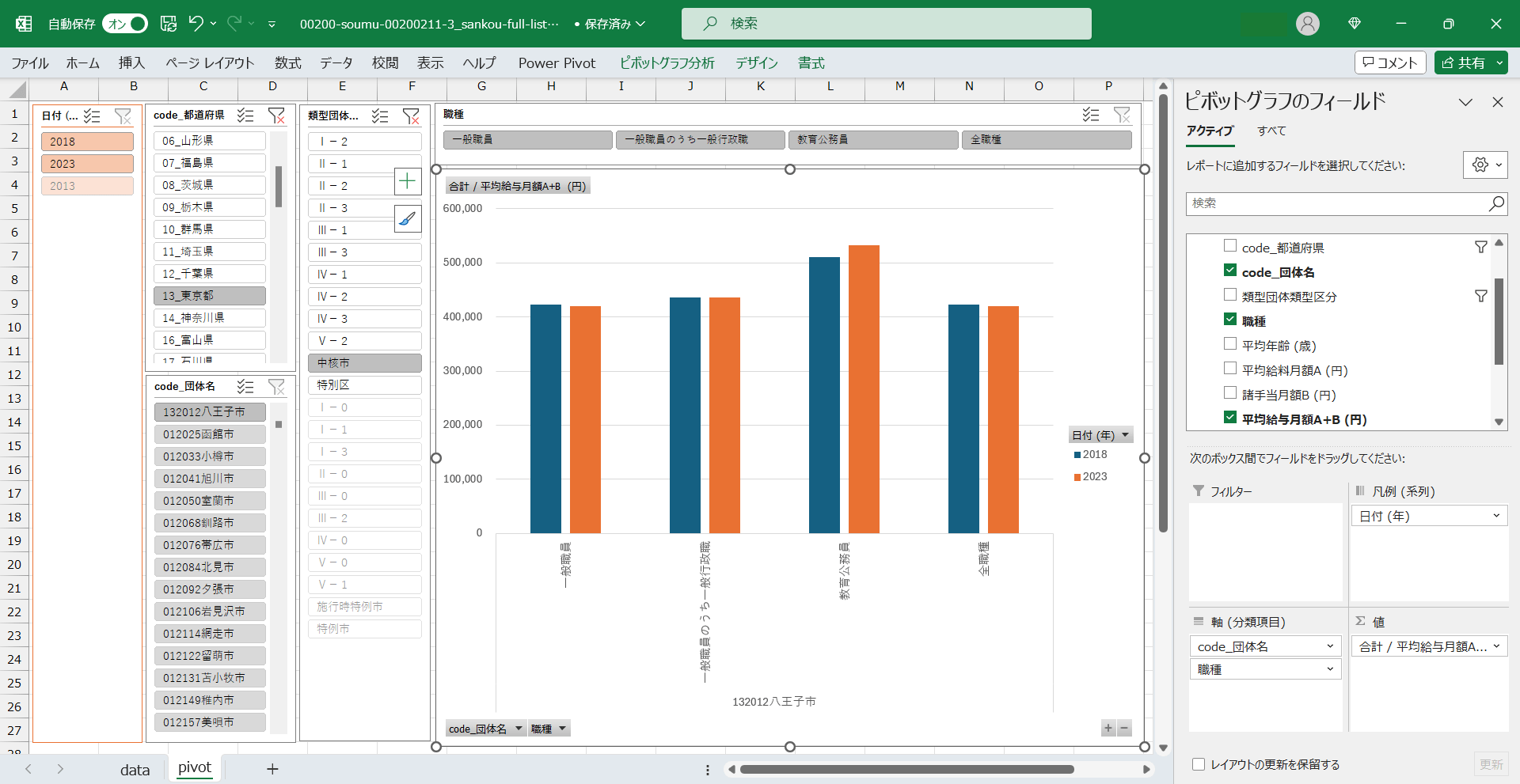 日付,団体区分,code_都道府県,code_団体名,類型団体類型区分,職種,平均年齢 (歳),平均給料月額A (円),諸手当月額B (円),平均給与月額A+B (円),平均給与月額(国ベース) (円) 2013/4/1,市区町村,01_北海道,012025函館市,中核市,一般職員のうち一般行政職,43.4,308677,54359,363036,343637 2013/4/1,市区町村,01_北海道,012025函館市,中核市,一般職員,42.1,307030,84362,391392,347215 2013/4/1,市区町村,01_北海道,012025函館市,中核市,教育公務員,46.8,386171,54675,440846,430772 2013/4/1,市区町村,01_北海道,012025函館市,中核市,全職種,42.2,309173,83509,392682,349429 2013/4/1,市区町村,01_北海道,012033小樽市,Ⅲ-3,一般職員,42.8,312180,76573,388753,346778 2013/4/1,市区町村,01_北海道,012033小樽市,Ⅲ-3,一般職員のうち一般行政職,43.4,311420,51239,362659,346286 2013/4/1,市区町村,01_北海道,012033小樽市,Ⅲ-3,全職種,42.8,312421,76514,388935,347072 2013/4/1,市区町村,01_北海道,012033小樽市,Ⅲ-3,教育公務員,46.4,378067,59489,437556,429750 2013/4/1,市区町村,01_北海道,012041旭川市,中核市,一般職員のうち一般行政職,41.7,319407,68400,387807,355079
