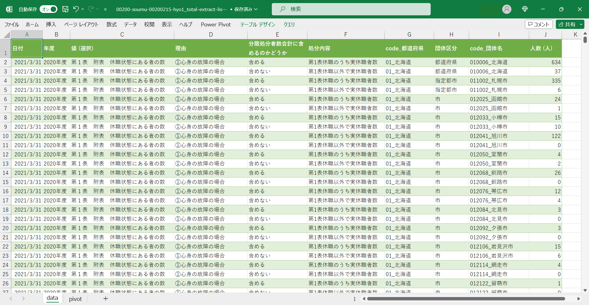 2021/3/31,2020年度,第1表 附表 休職状態にある者の数,①心身の故障の場合,含める,第1表休職のうち実休職者数,01_北海道,市,012025_函館市,24