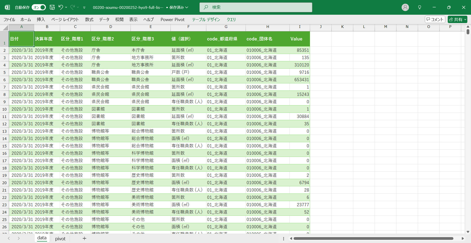 日付,決算年度,区分_階層1,区分_階層2,区分_階層3,値 (選択),code_都道府県,code_団体名,Value 2020/3/31,2019年度,その他施設,庁舎,本庁舎,延面積 (㎡),01_北海道,010006_北海道,85351 2020/3/31,2019年度,その他施設,庁舎,地方事務所,箇所数,01_北海道,010006_北海道,135 2020/3/31,2019年度,その他施設,庁舎,地方事務所,延面積 (㎡),01_北海道,010006_北海道,310120 2020/3/31,2019年度,その他施設,職員公舎,職員公舎,戸数 (戸),01_北海道,010006_北海道,9716 2020/3/31,2019年度,その他施設,職員公舎,職員公舎,延面積 (㎡),01_北海道,010006_北海道,653431 2020/3/31,2019年度,その他施設,県民会館,県民会館,箇所数,01_北海道,010006_北海道,1 2020/3/31,2019年度,その他施設,県民会館,県民会館,延面積 (㎡),01_北海道,010006_北海道,15243 2020/3/31,2019年度,その他施設,県民会館,県民会館,専任職員数 (人),01_北海道,010006_北海道,0 2020/3/31,2019年度,その他施設,図書館,図書館,箇所数,01_北海道,010006_北海道,1