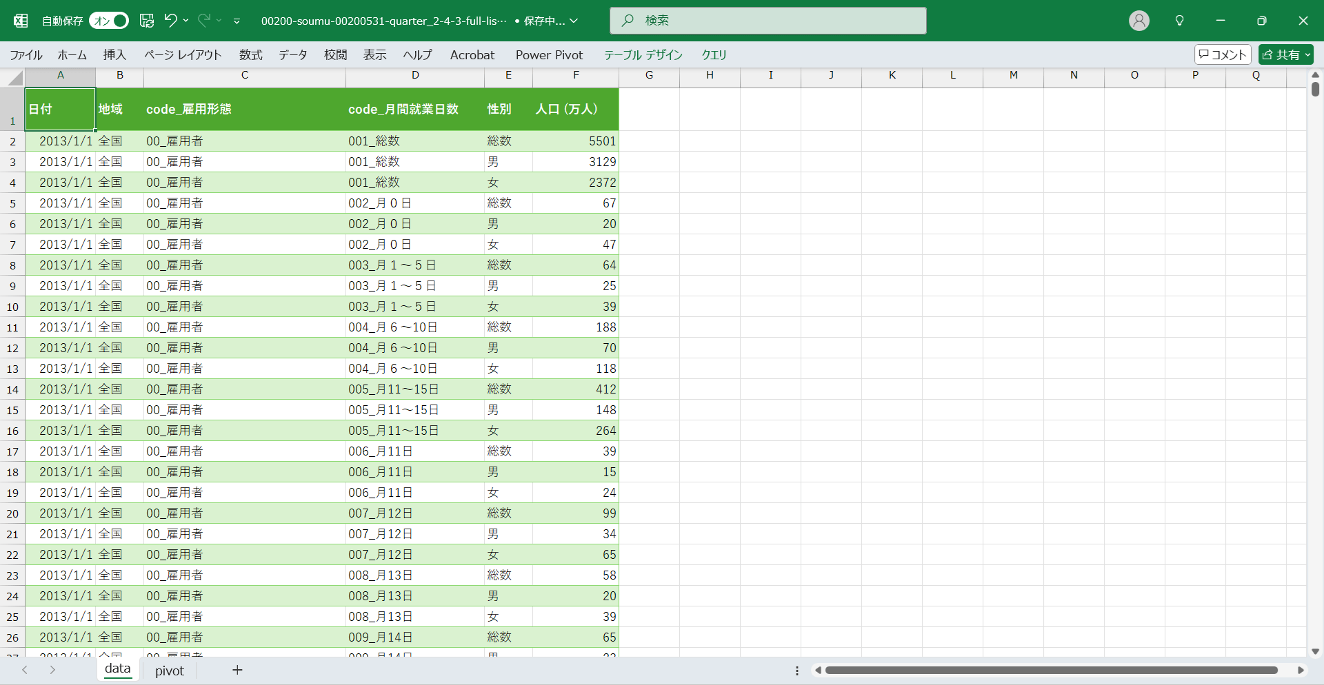 日付,地域,code_雇用形態,code_月間就業日数,性別,人口 (万人) 2013/1/1,全国,00_雇用者,001_総数,総数,5501 2013/1/1,全国,00_雇用者,001_総数,男,3129 2013/1/1,全国,00_雇用者,001_総数,女,2372 2013/1/1,全国,00_雇用者,002_月0日,総数,67 2013/1/1,全国,00_雇用者,002_月0日,男,20 2013/1/1,全国,00_雇用者,002_月0日,女,47 2013/1/1,全国,00_雇用者,003_月1~5日,総数,64 2013/1/1,全国,00_雇用者,003_月1~5日,男,25 2013/1/1,全国,00_雇用者,003_月1~5日,女,39