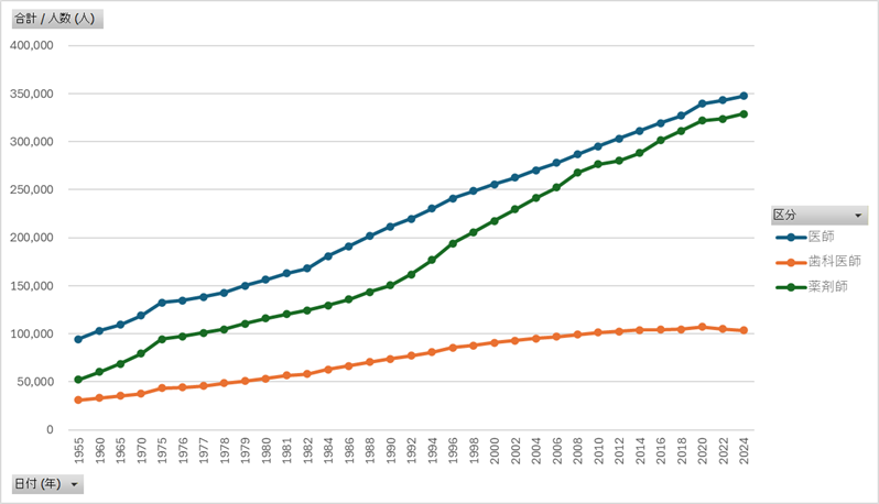 この投稿は厚生労働省が公表している「医師・歯科医師・薬剤師統計」をもとにデータ製作所が編集・作成したものです。政府または担当省庁が作成したものではありません。