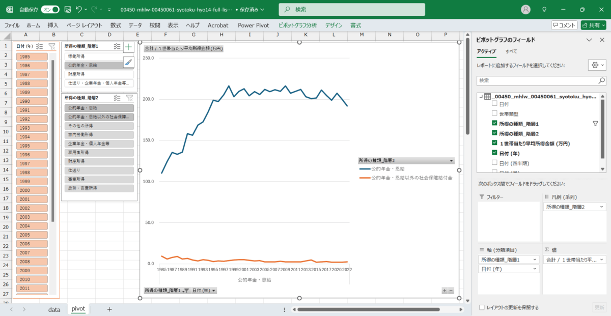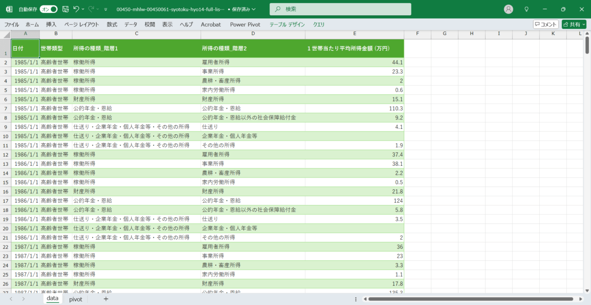 日付,世帯類型,所得の種類_階層1,所得の種類_階層2,1世帯当たり平均所得金額 (万円) 1985/1/1,高齢者世帯,稼働所得,雇用者所得,44.1 1985/1/1,高齢者世帯,稼働所得,事業所得,23.3 1985/1/1,高齢者世帯,稼働所得,農耕・畜産所得,2 1985/1/1,高齢者世帯,稼働所得,家内労働所得,0.6 1985/1/1,高齢者世帯,財産所得,財産所得,15.1 1985/1/1,高齢者世帯,公的年金・恩給,公的年金・恩給,110.3 1985/1/1,高齢者世帯,公的年金・恩給,公的年金・恩給以外の社会保障給付金,9.2 1985/1/1,高齢者世帯,仕送り・企業年金・個人年金等・その他の所得,仕送り,4.1 1985/1/1,高齢者世帯,仕送り・企業年金・個人年金等・その他の所得,企業年金・個人年金等,