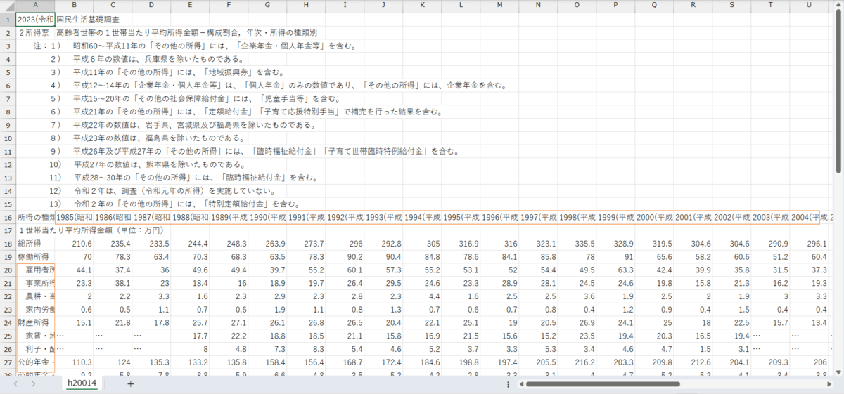 国民生活基礎調査_所得編_表14_高齢者世帯所得の種類別_高齢者世帯の1世帯あたり平均所得金額_年次 1985年 – 2023年 (列指向形式)