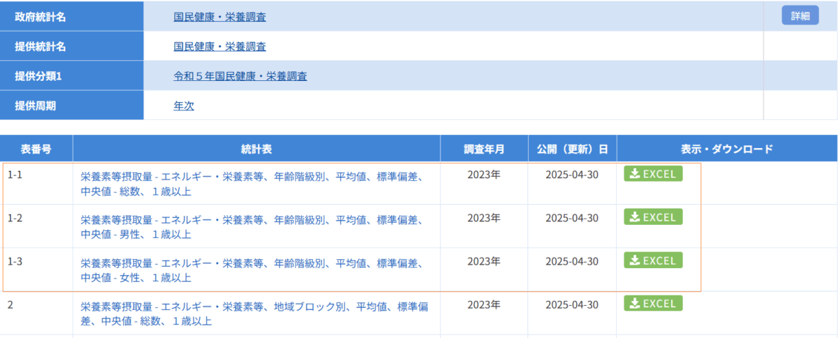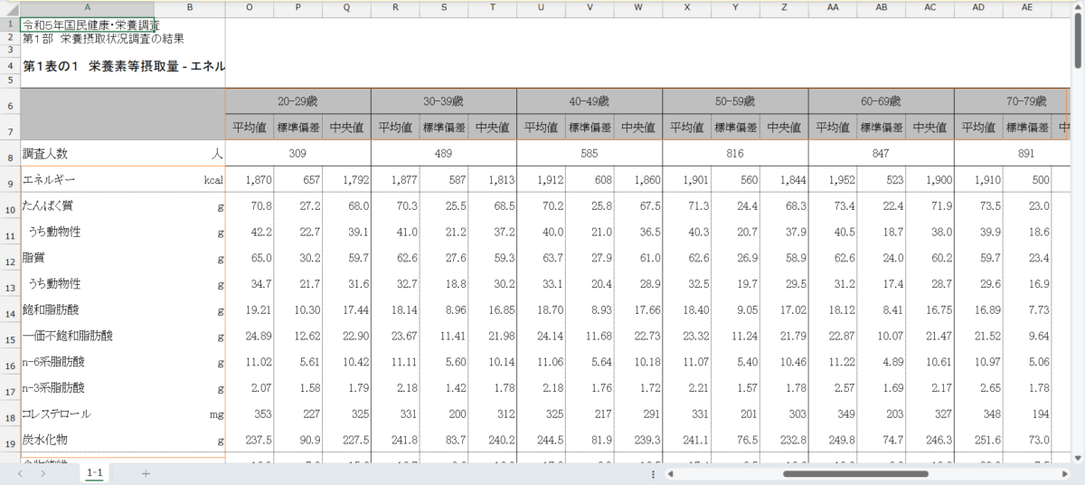 国民健康・栄養調査_表1_栄養素等摂取量_性別_年齢階級別_年次 2012年 – 2023年 (列 – 複数値形式)