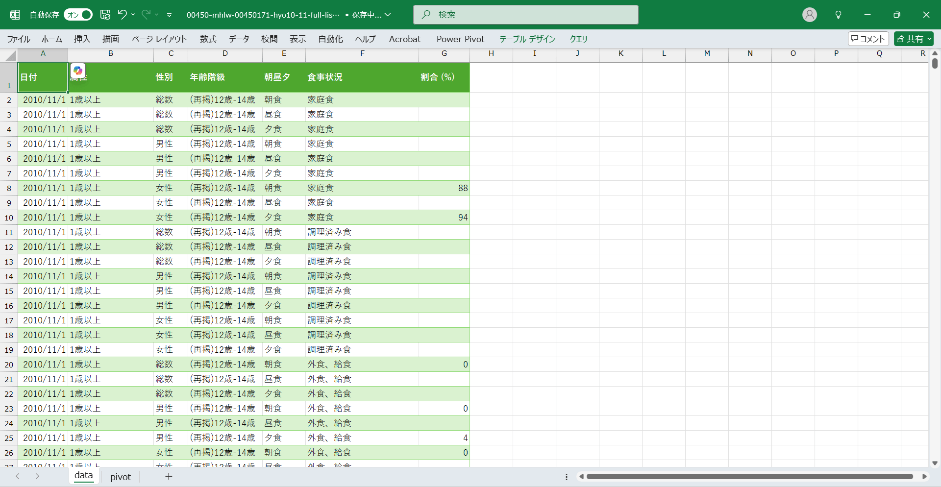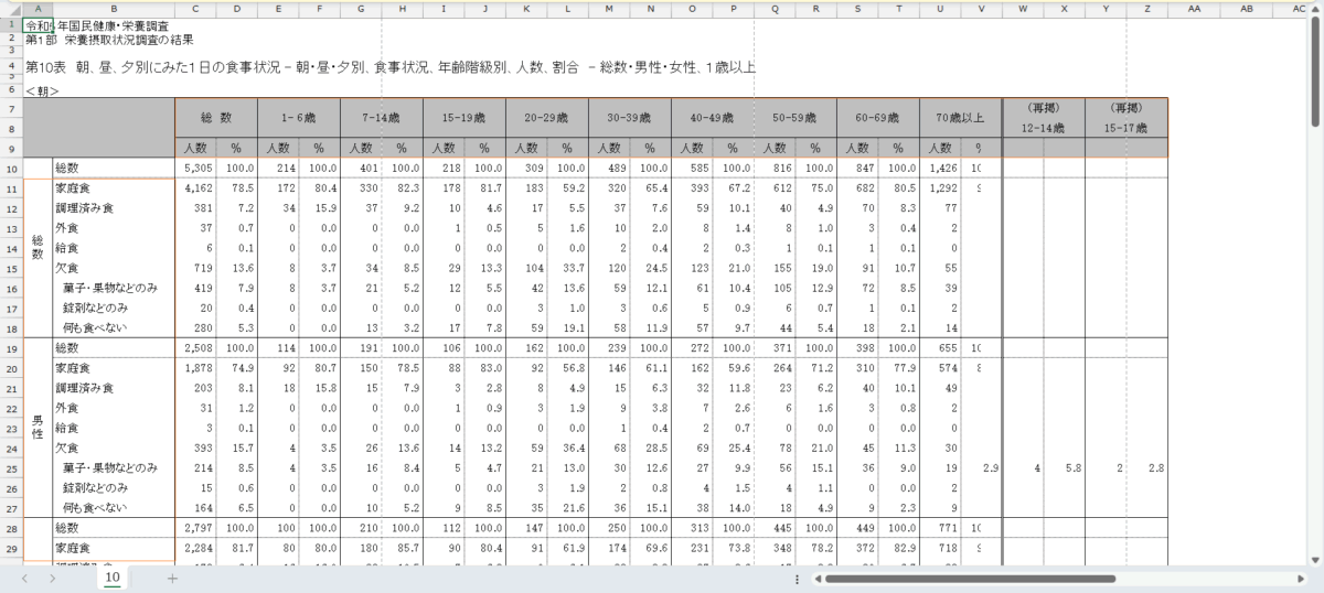 日付,属性,性別,年齢階級,朝昼夕,食事状況,割合 (%) 2010/11/1,1歳以上,総数,(再掲)12歳-14歳,朝食,家庭食, 2010/11/1,1歳以上,総数,(再掲)12歳-14歳,昼食,家庭食, 2010/11/1,1歳以上,総数,(再掲)12歳-14歳,夕食,家庭食, 2010/11/1,1歳以上,男性,(再掲)12歳-14歳,朝食,家庭食, 2010/11/1,1歳以上,男性,(再掲)12歳-14歳,昼食,家庭食, 2010/11/1,1歳以上,男性,(再掲)12歳-14歳,夕食,家庭食, 2010/11/1,1歳以上,女性,(再掲)12歳-14歳,朝食,家庭食,88 2010/11/1,1歳以上,女性,(再掲)12歳-14歳,昼食,家庭食, 2010/11/1,1歳以上,女性,(再掲)12歳-14歳,夕食,家庭食,94