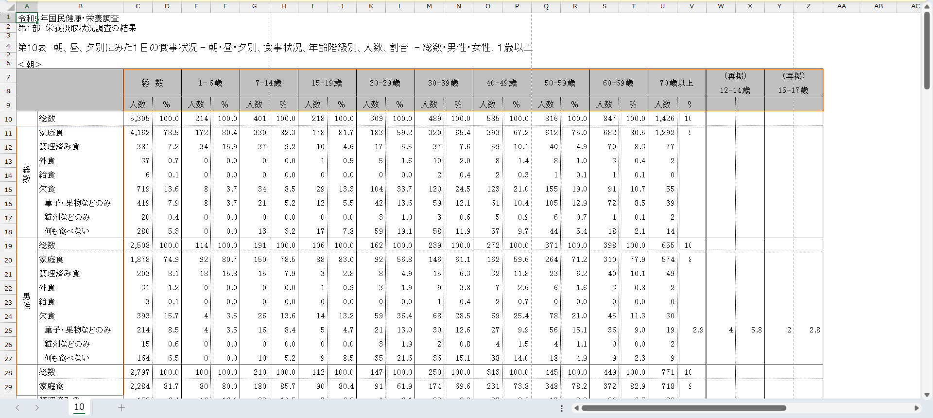 国民健康・栄養調査_表10-11_朝,昼,夕別にみた1日の食事状況_性別_年齢階級別_年次 2010年 – 2023年 (列指向形式)