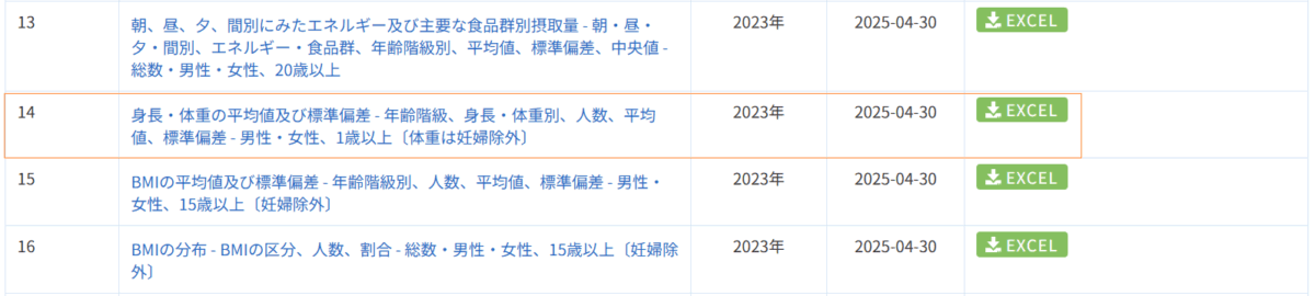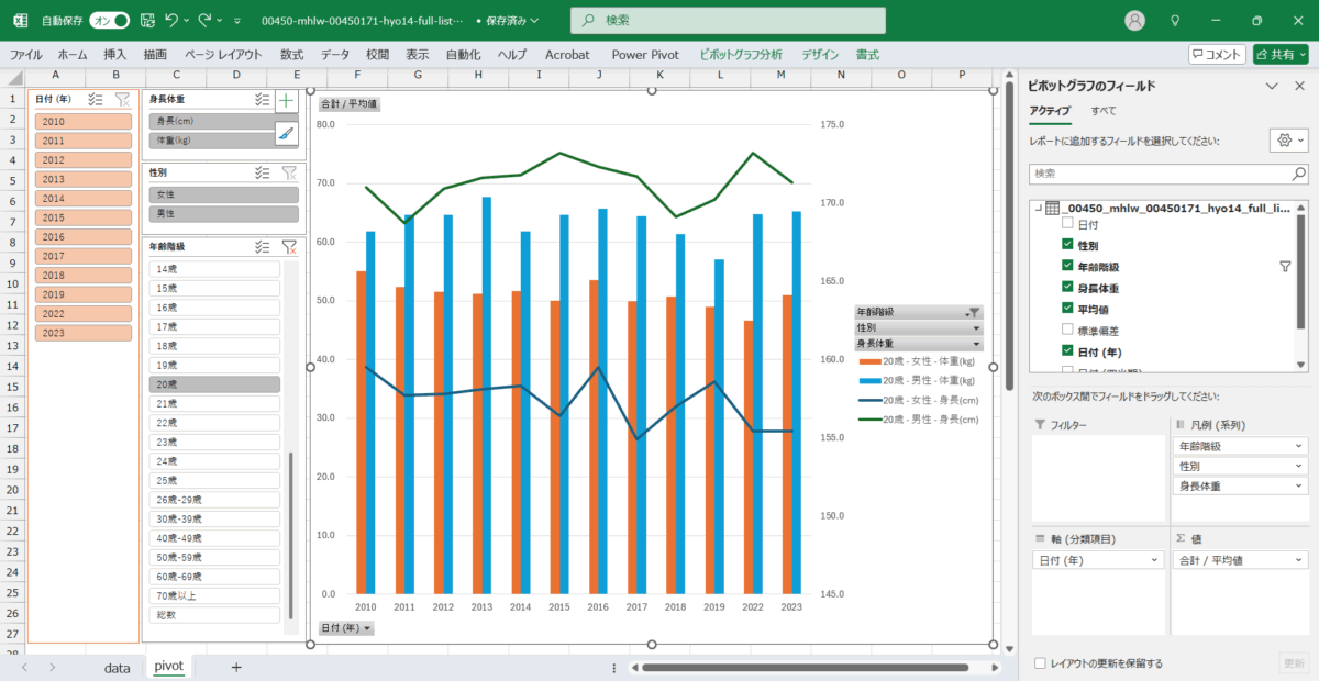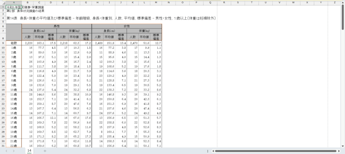国民健康・栄養調査_表14_身長・体重の平均値及び標準偏差_性別_年齢階級別_年次 2010年 – 2023年 (列 – 複数値形式)
