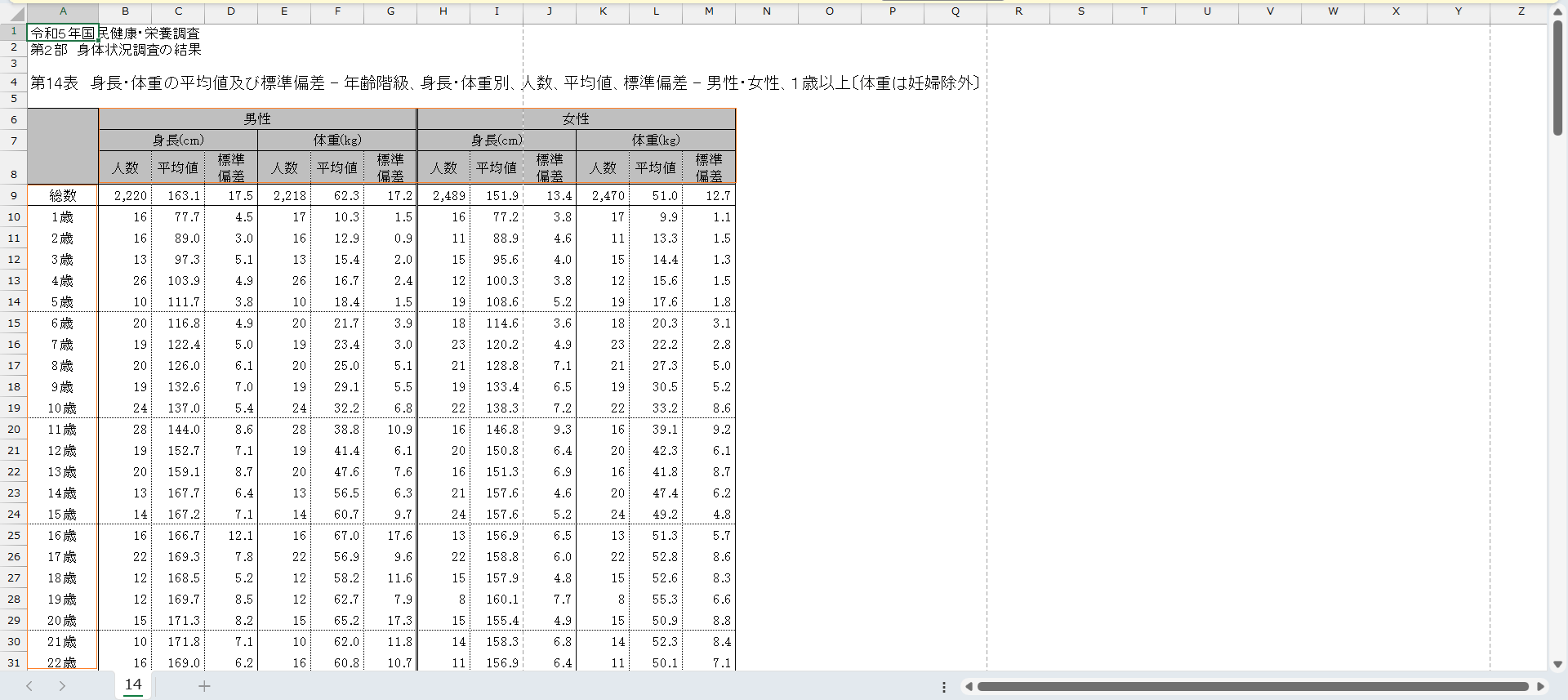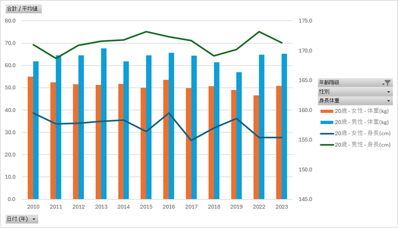 国民健康・栄養調査_表14_身長・体重の平均値及び標準偏差_性別_年齢階級別_年次 2010年 – 2023年 (列 – 複数値形式)