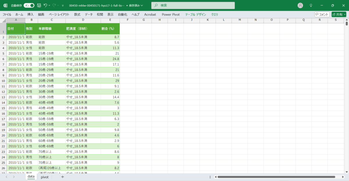 日付,性別,年齢階級,肥満度(BMI),割合 (%) 2010/11/1,総数,総数,やせ_18.5未満,8.7 2010/11/1,男性,総数,やせ_18.5未満,5.6 2010/11/1,女性,総数,やせ_18.5未満,11.3 2010/11/1,総数,15歳-19歳,やせ_18.5未満,21 2010/11/1,男性,15歳-19歳,やせ_18.5未満,24.8 2010/11/1,女性,15歳-19歳,やせ_18.5未満,17.1 2010/11/1,総数,20歳-29歳,やせ_18.5未満,21 2010/11/1,男性,20歳-29歳,やせ_18.5未満,11.6 2010/11/1,女性,20歳-29歳,やせ_18.5未満,29