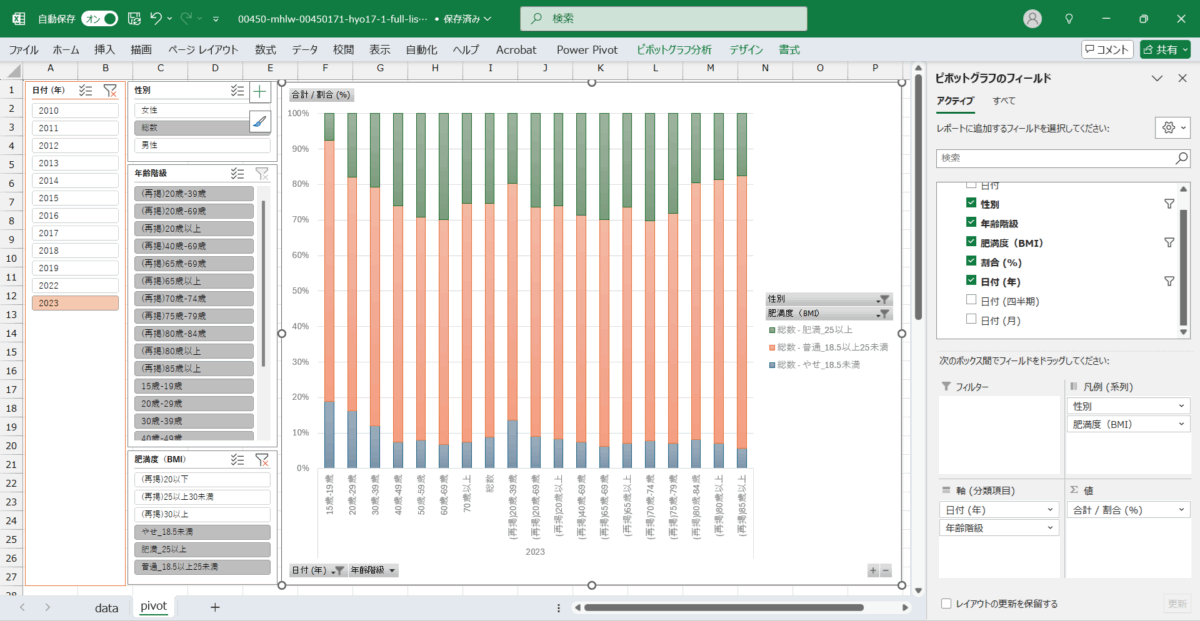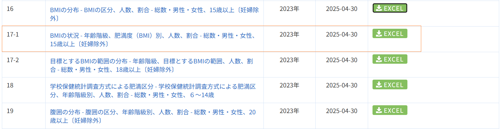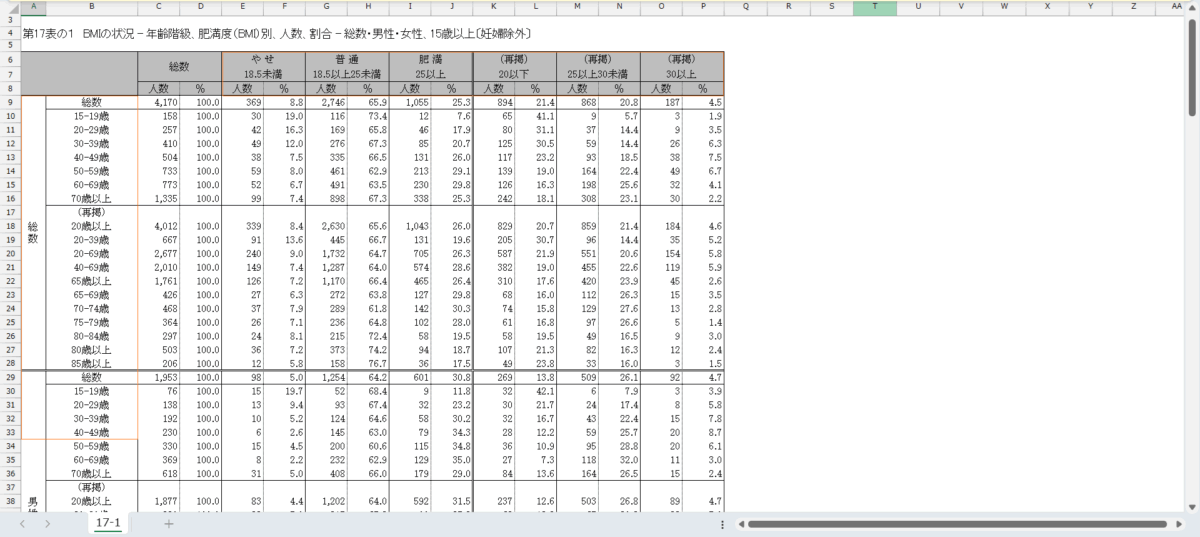 国民健康・栄養調査_表17-1_BMIの状況_性別_年齢階級別_年次 2010年 – 2023年 (列指向形式)