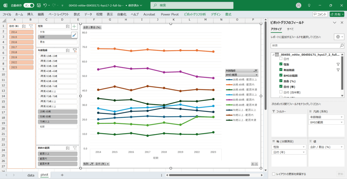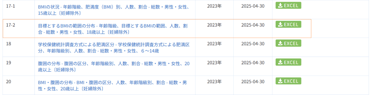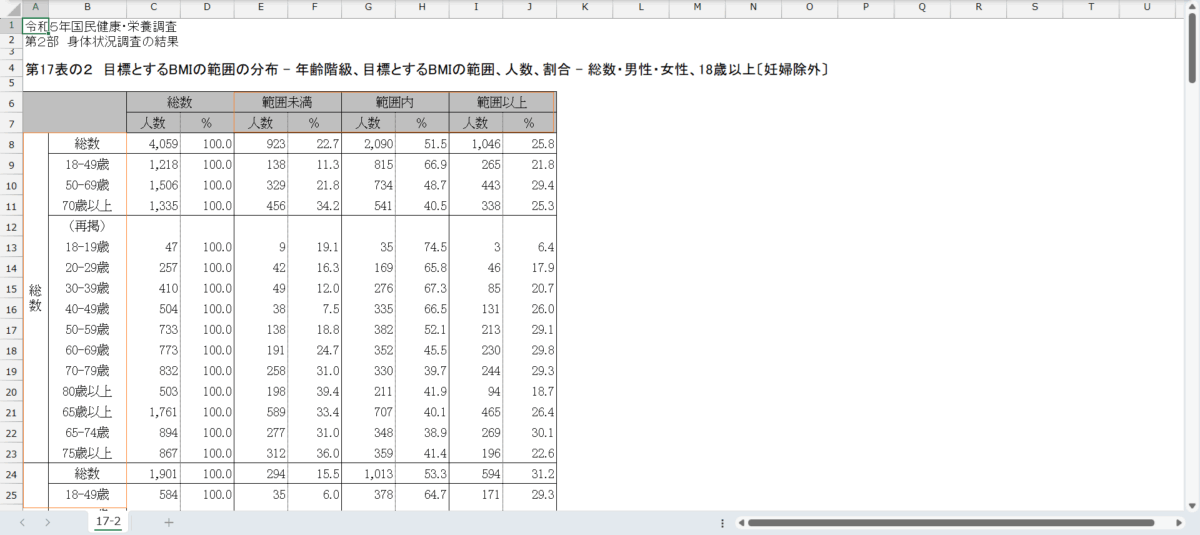 国民健康・栄養調査_表17-2_目標とするBMIの範囲の分布_性別_年齢階級別_年次 2014年 – 2023年 (列指向形式)