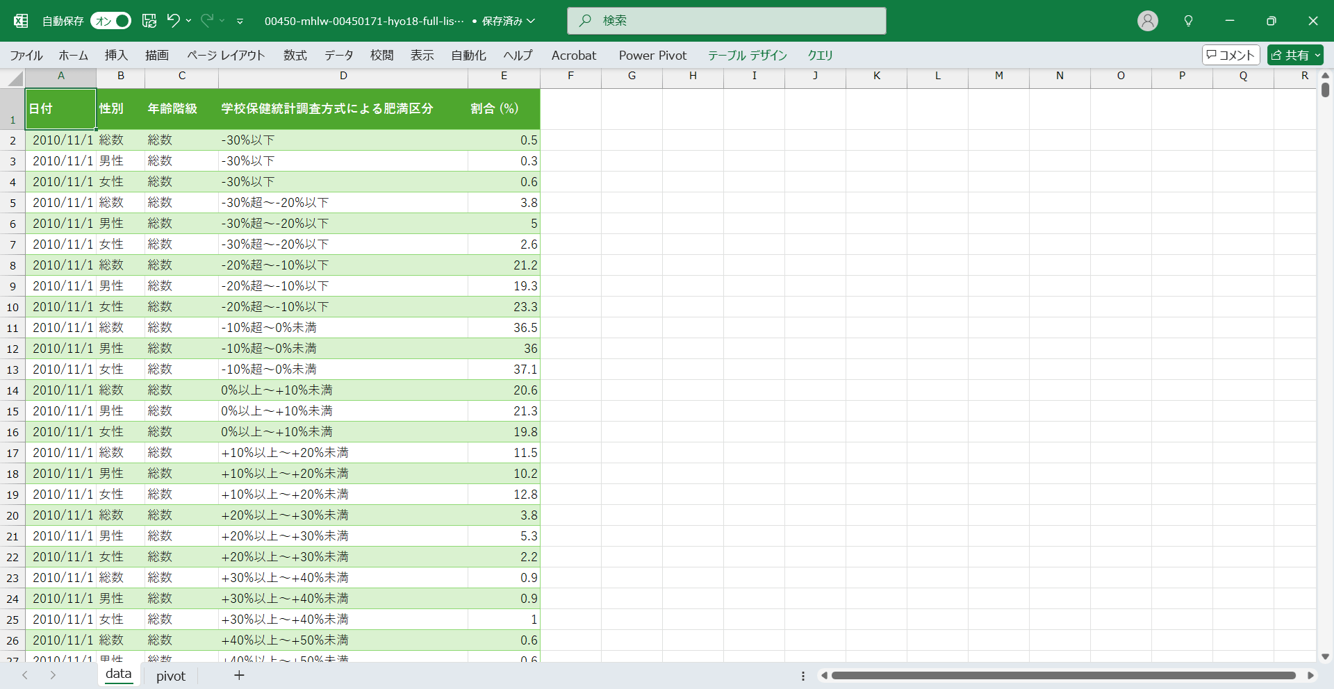 日付,性別,年齢階級,学校保健統計調査方式による肥満区分,割合 (%) 2010/11/1,総数,総数,-30%以下,0.5 2010/11/1,男性,総数,-30%以下,0.3 2010/11/1,女性,総数,-30%以下,0.6 2010/11/1,総数,総数,-30%超~-20%以下,3.8 2010/11/1,男性,総数,-30%超~-20%以下,5 2010/11/1,女性,総数,-30%超~-20%以下,2.6 2010/11/1,総数,総数,-20%超~-10%以下,21.2 2010/11/1,男性,総数,-20%超~-10%以下,19.3 2010/11/1,女性,総数,-20%超~-10%以下,23.3