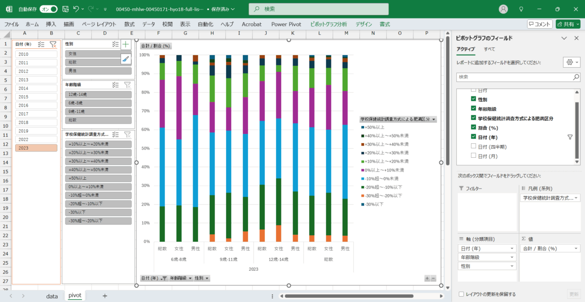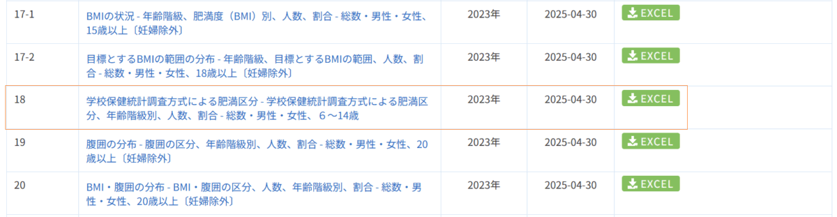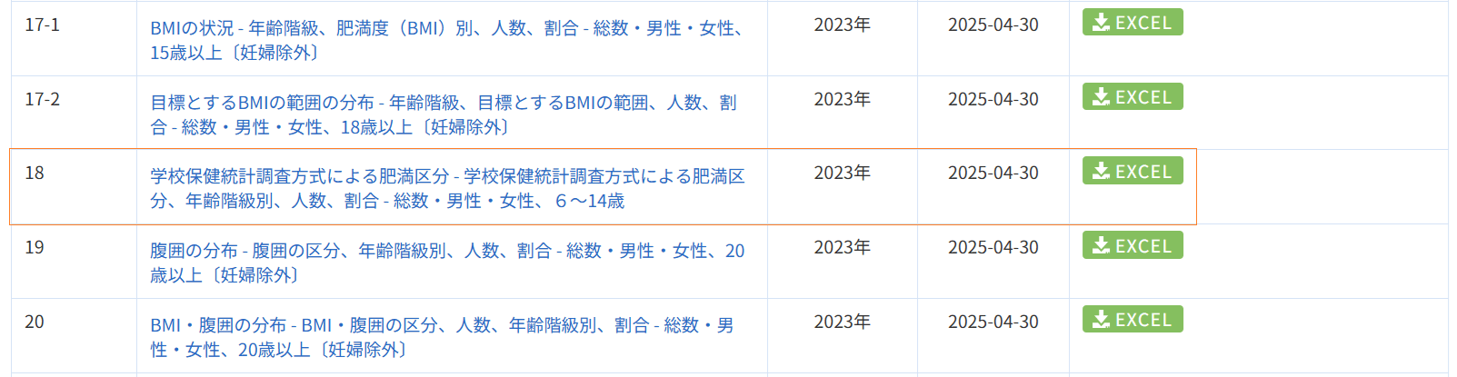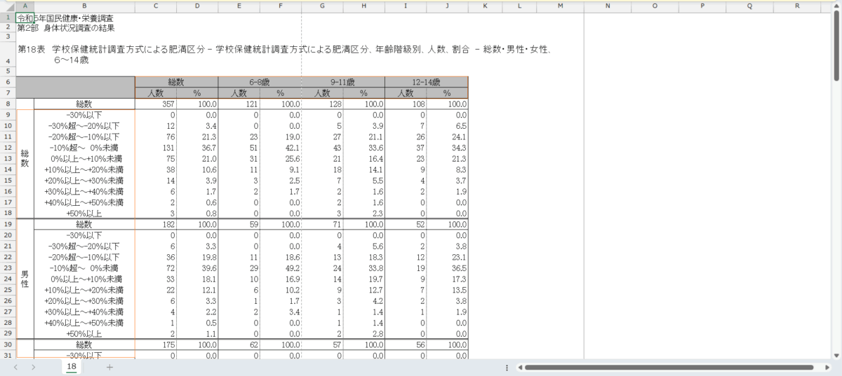 国民健康・栄養調査_表18_学校保健統計調査方式による肥満区分_性別_年齢階級別_年次 2010年 – 2023年 (列指向形式)