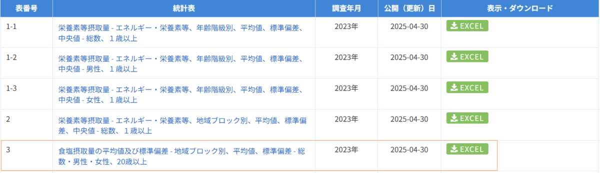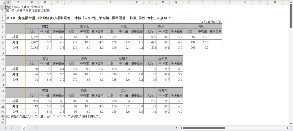 国民健康・栄養調査_表3_塩分摂取量_性別_地域ブロック別_年次 2012年 – 2023年 (列 – 複数値形式)