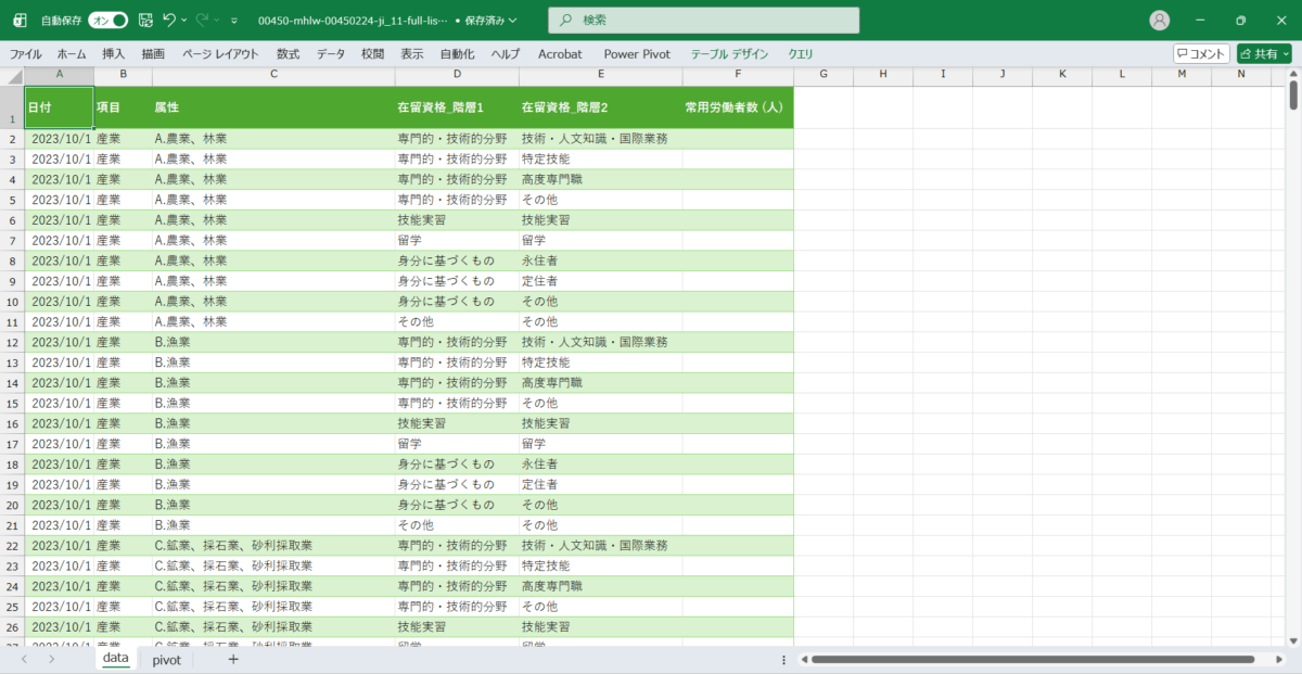 日付,項目,属性,在留資格_階層1,在留資格_階層2,常用労働者数 (人) 2023/10/1,産業,A.農業、林業,専門的・技術的分野,技術・人文知識・国際業務, 2023/10/1,産業,A.農業、林業,専門的・技術的分野,特定技能, 2023/10/1,産業,A.農業、林業,専門的・技術的分野,高度専門職, 2023/10/1,産業,A.農業、林業,専門的・技術的分野,その他, 2023/10/1,産業,A.農業、林業,技能実習,技能実習, 2023/10/1,産業,A.農業、林業,留学,留学, 2023/10/1,産業,A.農業、林業,身分に基づくもの,永住者, 2023/10/1,産業,A.農業、林業,身分に基づくもの,定住者, 2023/10/1,産業,A.農業、林業,身分に基づくもの,その他,