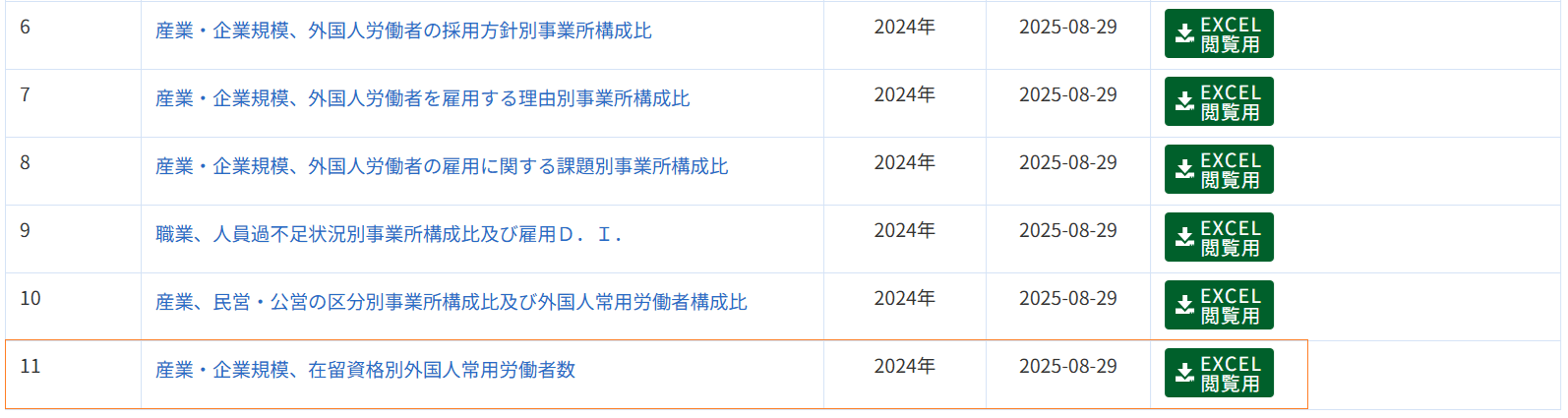 外国人雇用実態調査_事業所調査_表11_産業・企業規模、在留資格別外国人常用労働者数_年次 2023年 – 2024年 (列指向形式)