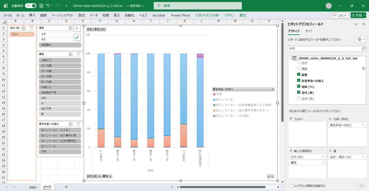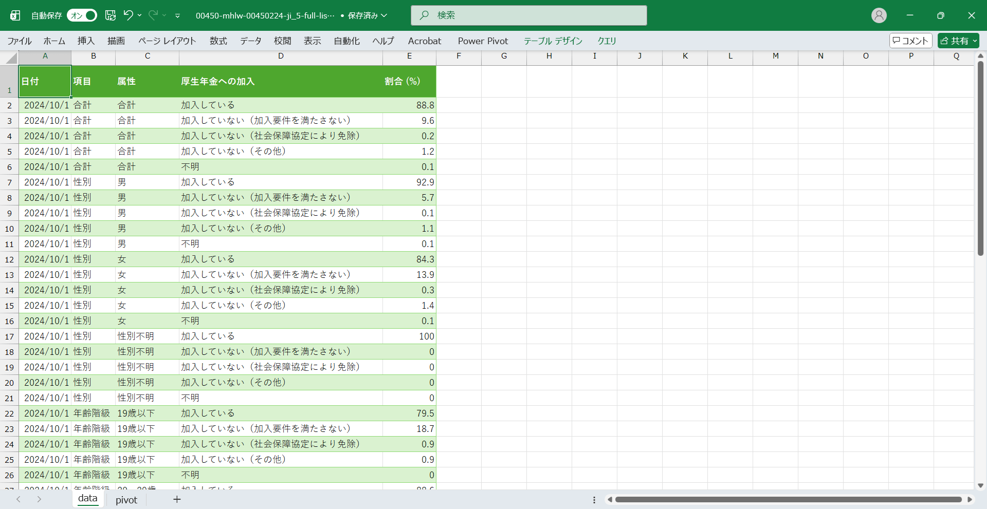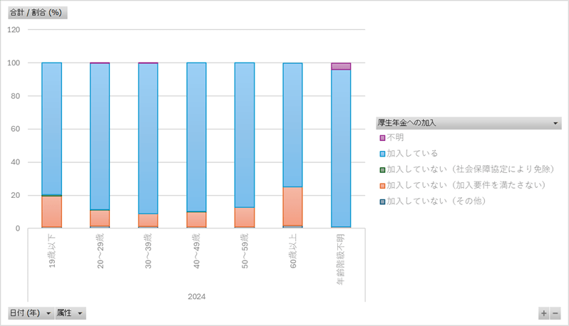日付,項目,属性,厚生年金への加入,割合 (%) 2024/10/1,合計,合計,加入している,88.8 2024/10/1,合計,合計,加入していない(加入要件を満たさない),9.6 2024/10/1,合計,合計,加入していない(社会保障協定により免除),0.2 2024/10/1,合計,合計,加入していない(その他),1.2 2024/10/1,合計,合計,不明,0.1 2024/10/1,性別,男,加入している,92.9 2024/10/1,性別,男,加入していない(加入要件を満たさない),5.7 2024/10/1,性別,男,加入していない(社会保障協定により免除),0.1 2024/10/1,性別,男,加入していない(その他),1.1
