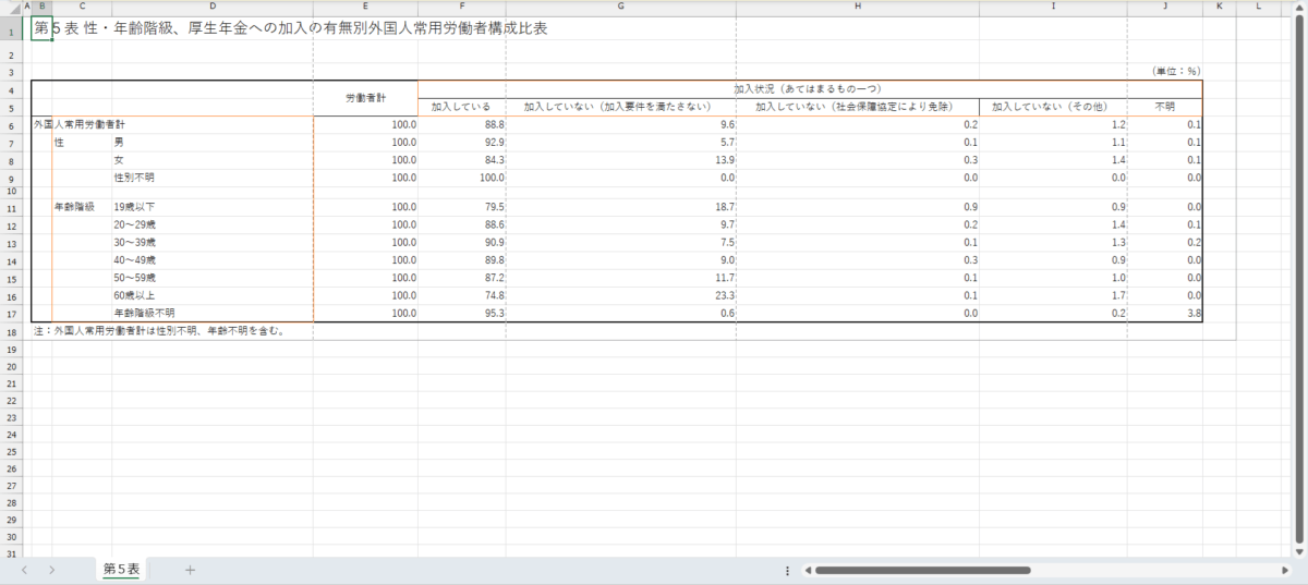 外国人雇用実態調査_事業所調査_表5_性・年齢階級、厚生年金への加入の有無別外国人常用労働者構成比_年次 2024年 (列指向形式)