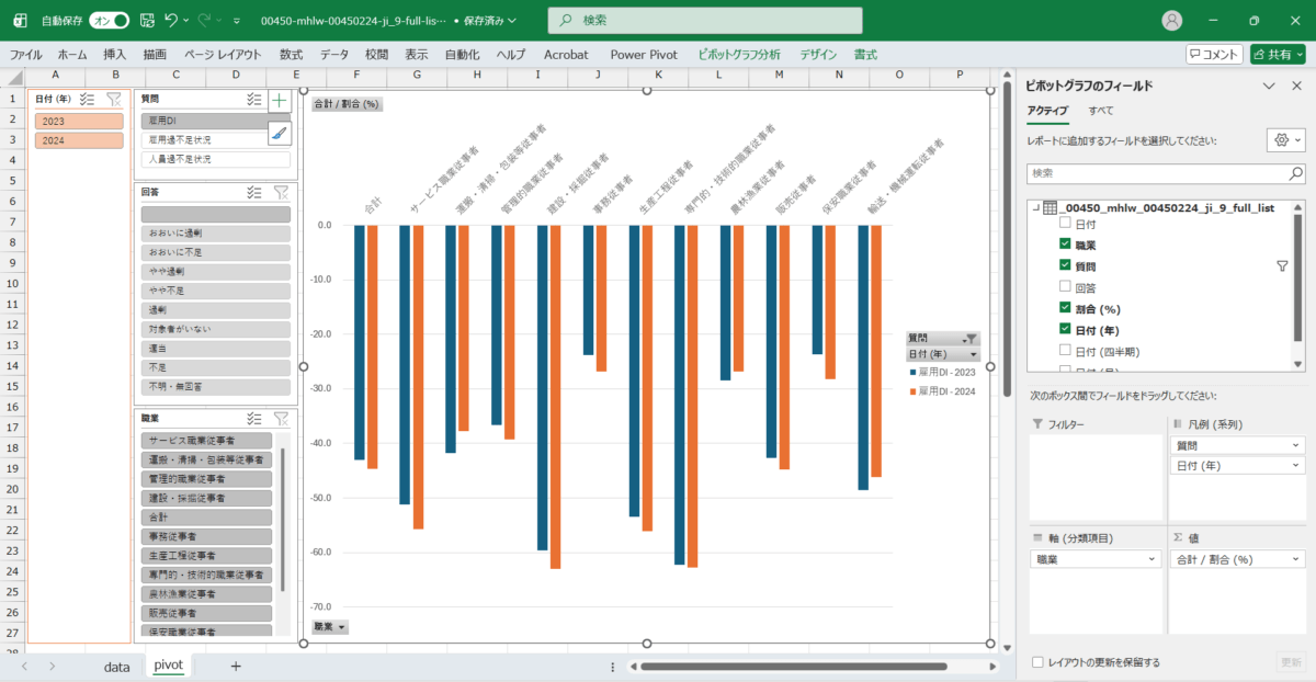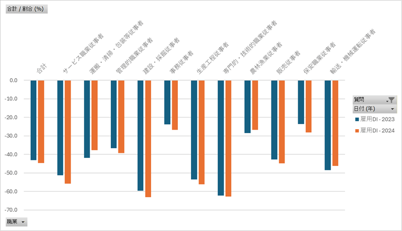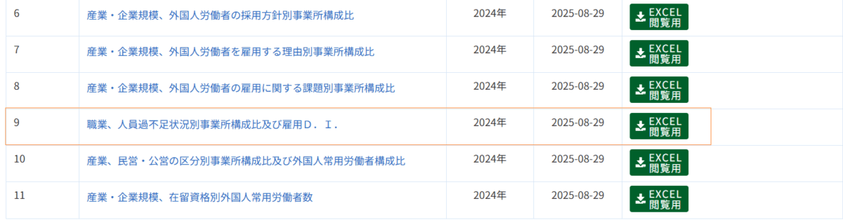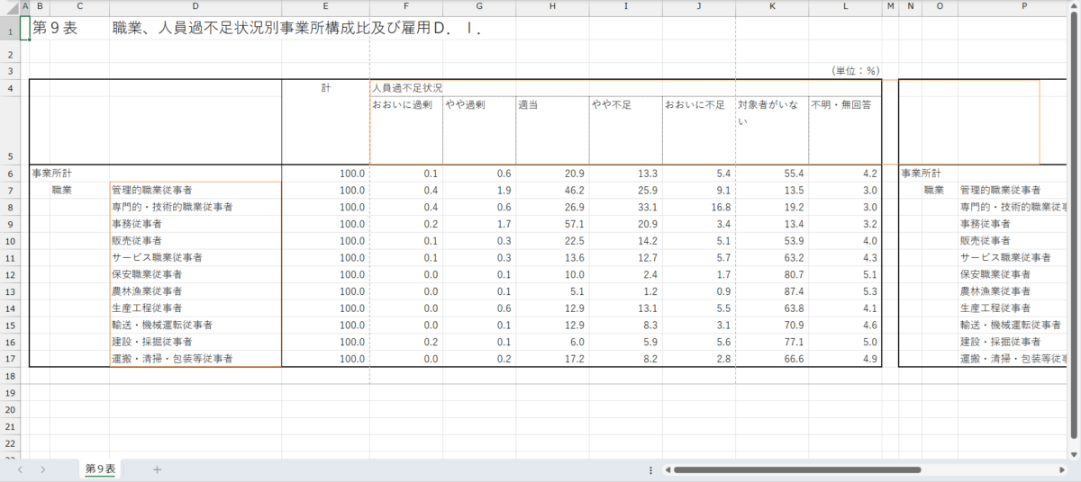 外国人雇用実態調査_事業所調査_表9_職業、人員過不足状況別事業所構成比及び雇用D.I._年次 2023年 – 2024年 (列指向形式)