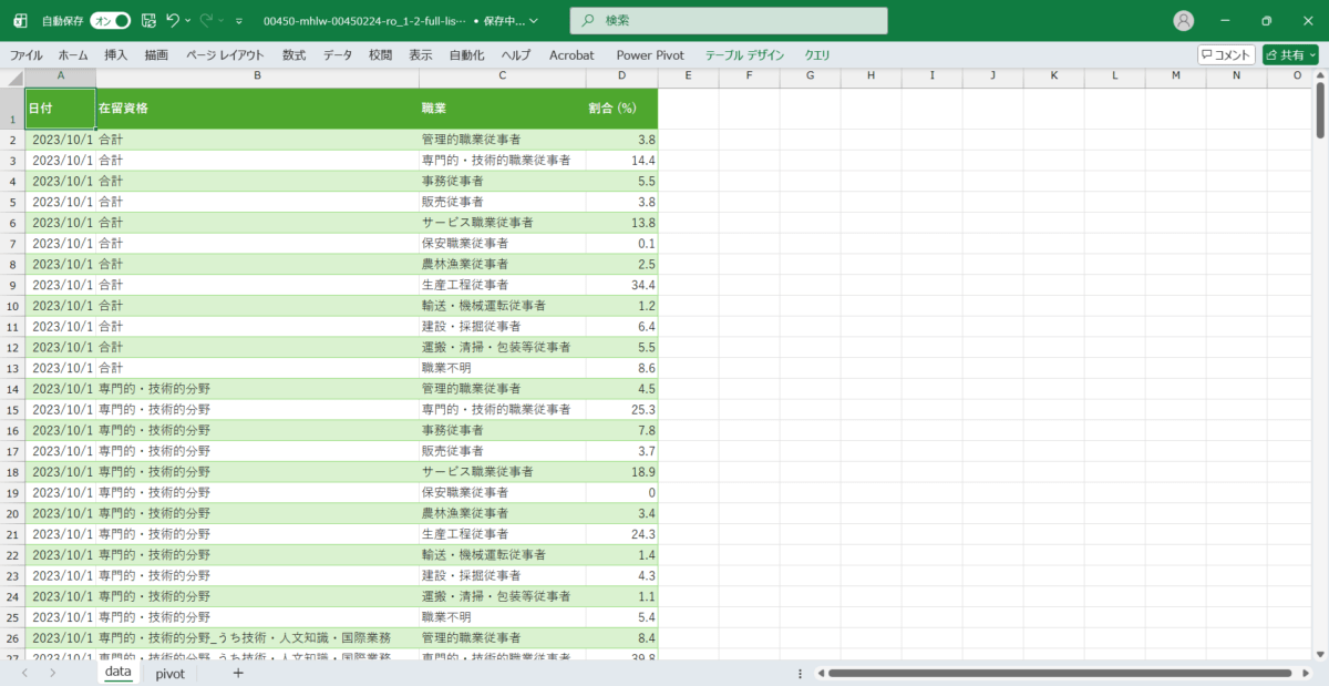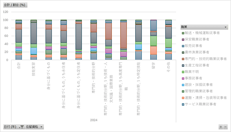 日付,在留資格,職業,割合 (%) 2023/10/1,合計,管理的職業従事者,3.8 2023/10/1,合計,専門的・技術的職業従事者,14.4 2023/10/1,合計,事務従事者,5.5 2023/10/1,合計,販売従事者,3.8 2023/10/1,合計,サービス職業従事者,13.8 2023/10/1,合計,保安職業従事者,0.1 2023/10/1,合計,農林漁業従事者,2.5 2023/10/1,合計,生産工程従事者,34.4 2023/10/1,合計,輸送・機械運転従事者,1.2